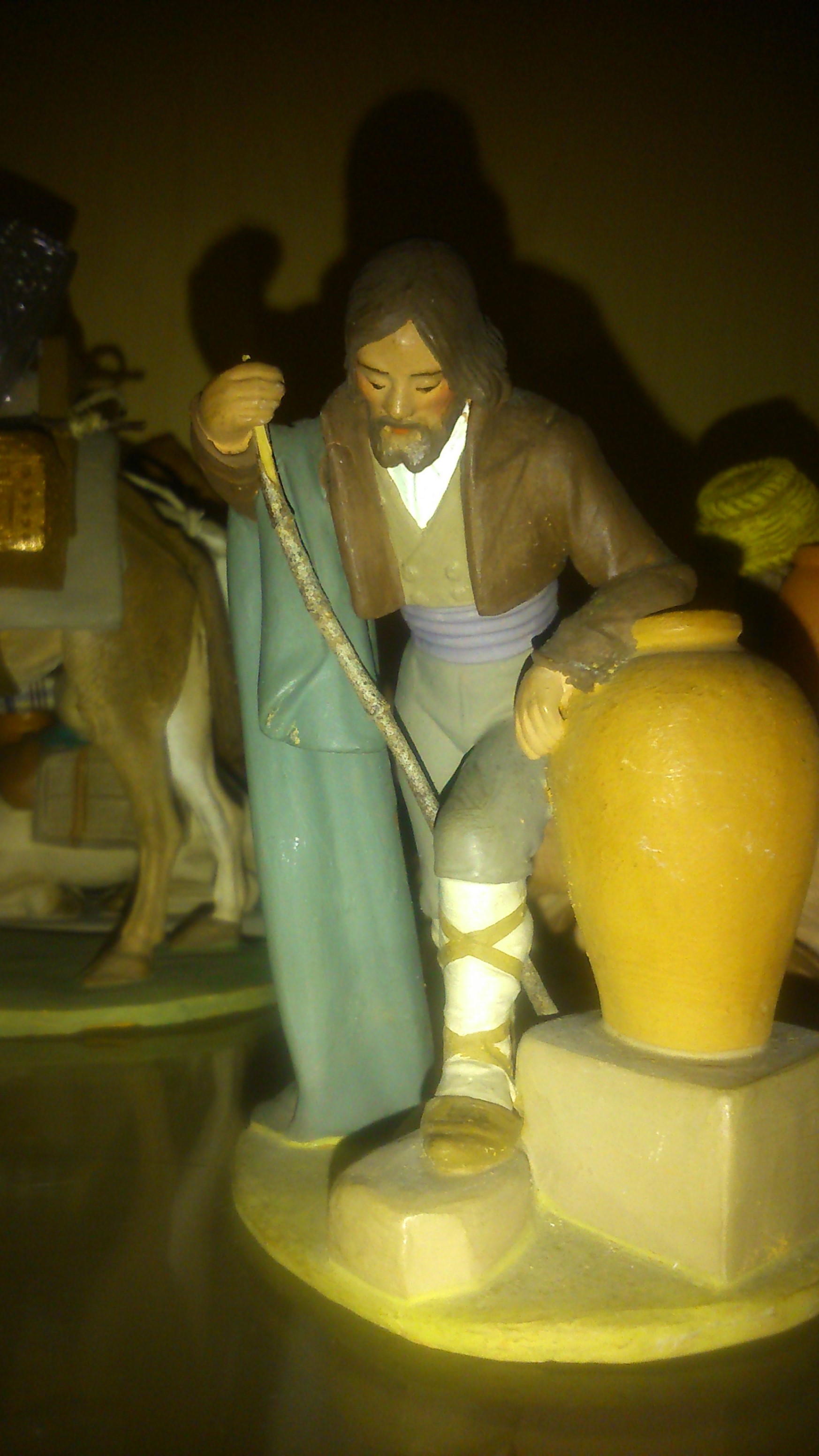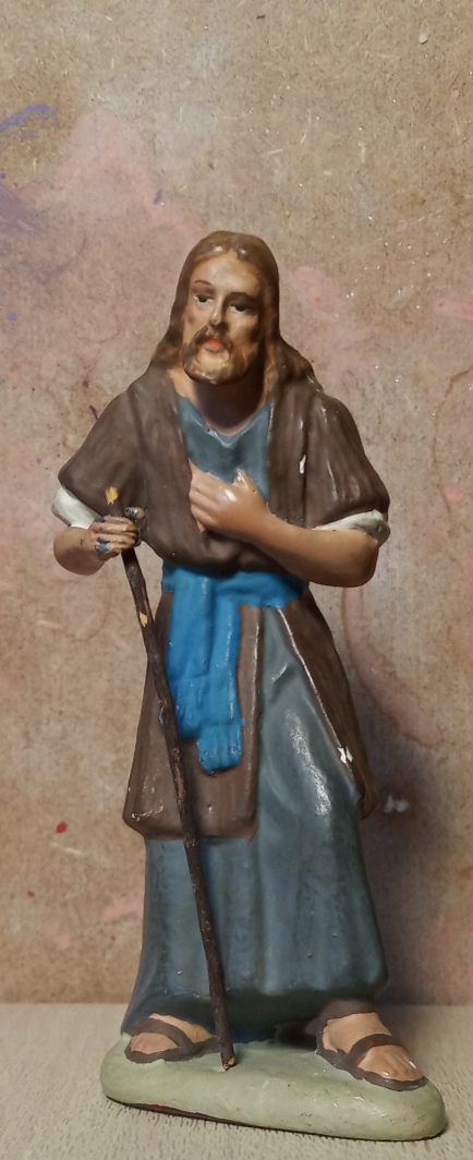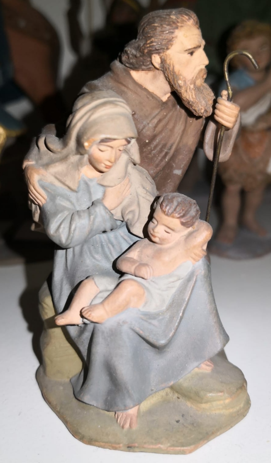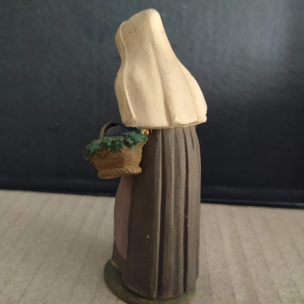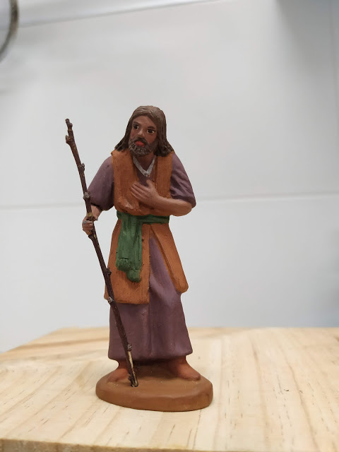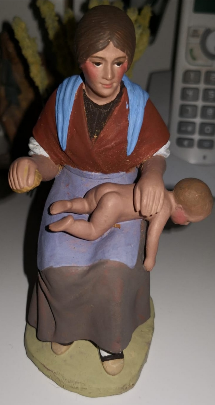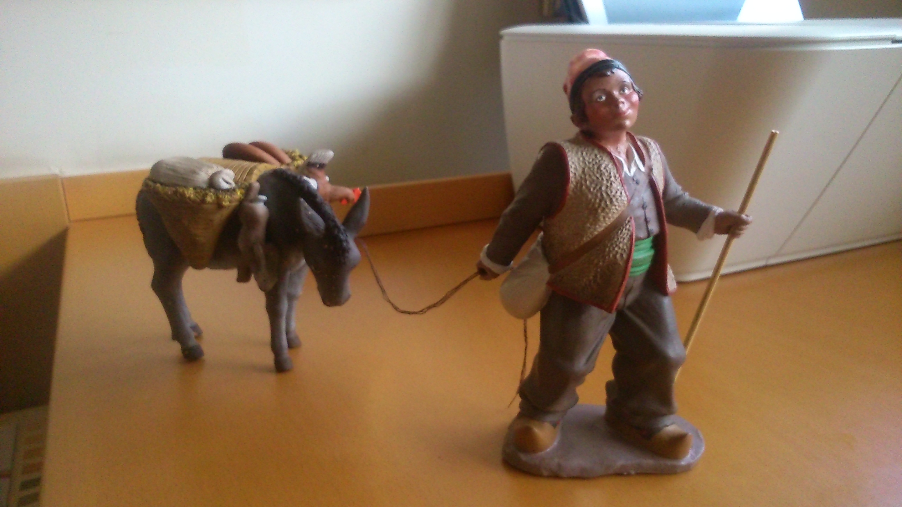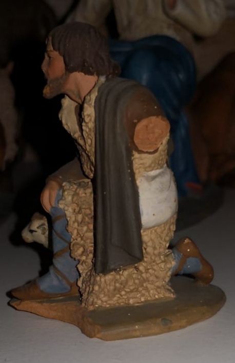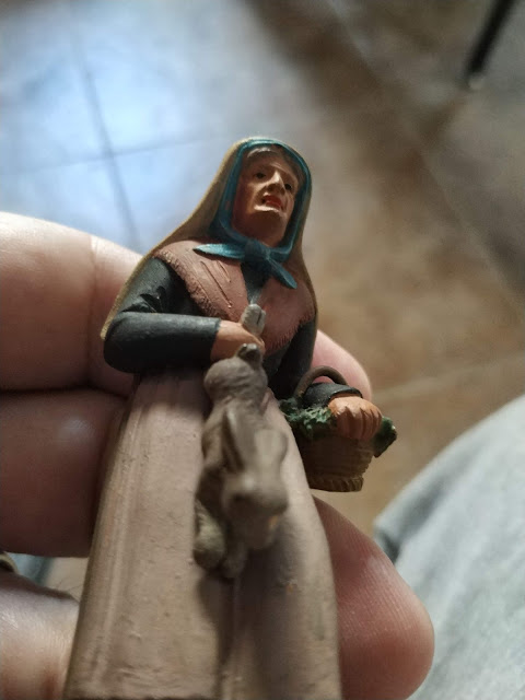 La figura es de aprox. 9cms., es maravillosa no sólo por el detalle en justa medida a su (aparente) tamaño también por la belleza y sentimiento que desprende y que mejora a la lámina(en mi opinión), aparte es muy versátil para un belén puede estar en una huida como en un nacimiento.
