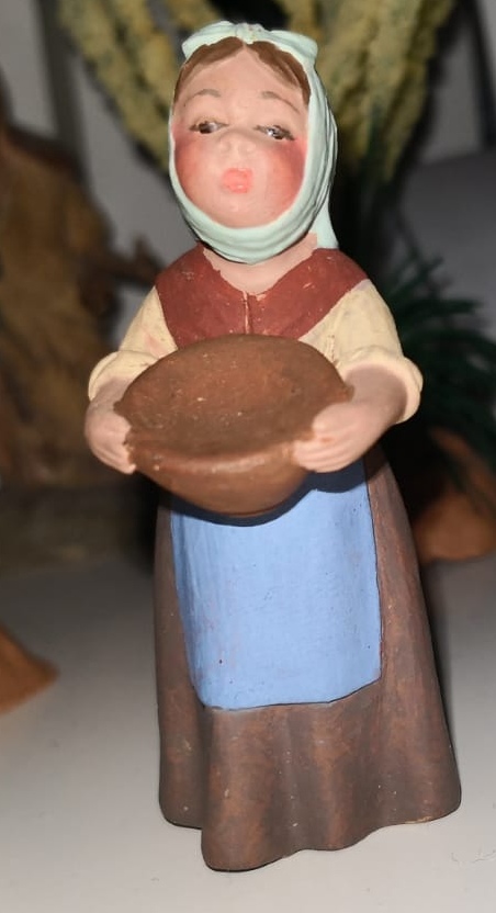 La figura es de aprox. 9cms., es maravillosa no sólo por el detalle en justa medida a su (aparente) tamaño también por la belleza y sentimiento que desprende y que mejora a la lámina(en mi opinión), aparte es muy versátil para un belén puede estar en una huida como en un nacimiento.