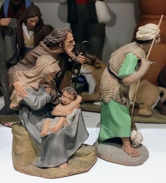 En un lote me llegaron, además de una Virgen y un San José, una viejecita muy típica. A la Sagrada Pareja la ubiqué en escenas como la Presentación ante los sabios o El Niño perdido, opciones perfectamente válidas. Sin embargo, según recoge Enric Benavent en su libro Lluís Carratalà, escultor noucentista de belenes , en realidad corresponde a la escena de Buscando posada.