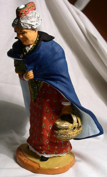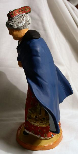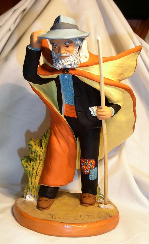 Pues ya lo veis, el Pastor bajo el golpe del Mistral y Mme. Renaude, creaciones ambas, originales, de la Maison Santons Fouque, hoy dirigida por Mireille Foque. Las figuras son de 20 cm. y son una preciosidad. Destaca, por supuesto, el pastor por su originalidad, el vuelo de su capa, la naturalidad del gesto... pero lo que es magnífico, y en las fotos no se ve bien, es la belleza de sus colores, que son... indescriptibles. Eso lo es mucho más en la Renaude, no solamente en el azul oscuro de su capa (indudablemente inspirado en el manto de Nuestra Señora la Virgen María), si no, sobre todo, en el estampado de su vestido y de su chal, que es una filigrana preciosa... solamente puedo deciros que ya pueden venir toda la masa de desarrapados a intentar mangarme las figuras del despacho, que éstas me las he traído a casa para que hagan compañía (por no decir competencia) a mis dos Traités... ¿quién podrá más, la Tramontana o el Mistral?