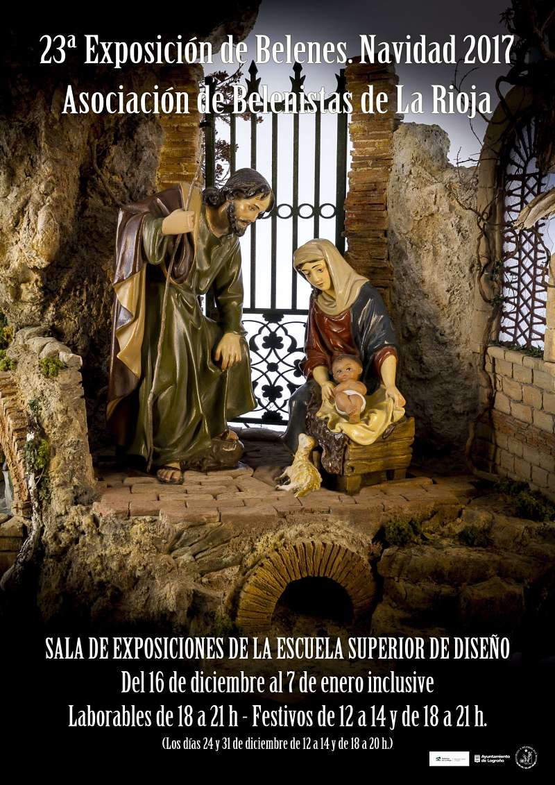 Hola a todos, comparto el cartel de la Asociación de Belenistas de La Rioja con los horarios y fecha para poder visitar nuestra Exposición de Belenes instalada en la Escuela Superior de Diseño de La Rioja (Esdir), Avda. de la Paz nº 9, entrada por el Paseo de Dax, justo al lado del Ayuntamiento donde podrás visitar también el belén monumental. No te pierdas esta interesante visita.