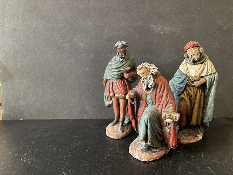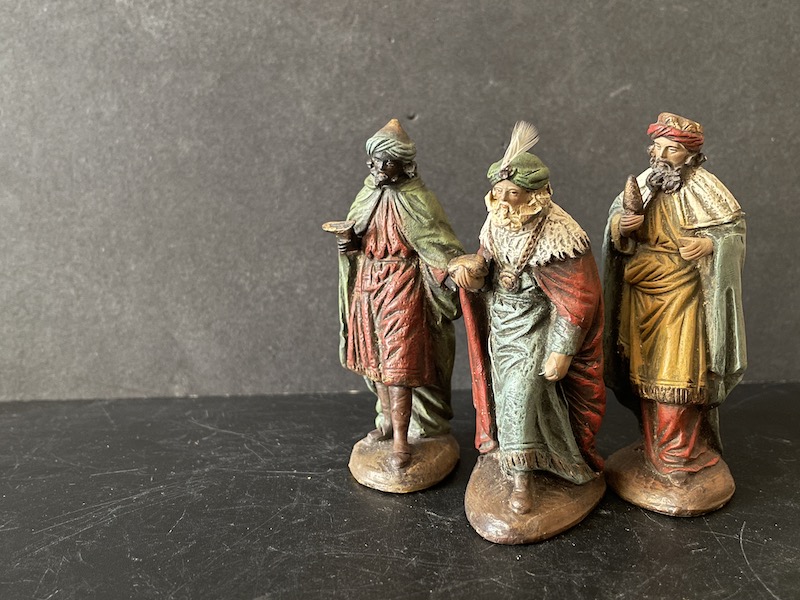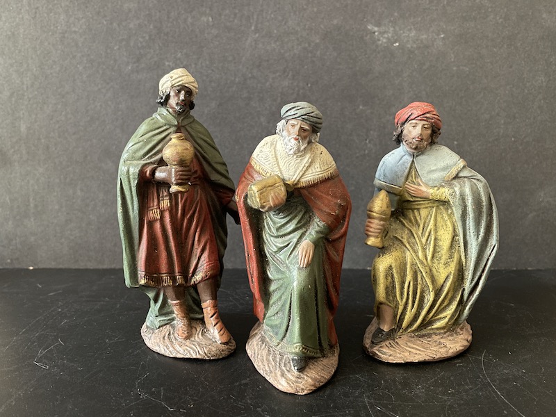 Reyes Magos de moldes originales hechos para la fábrica de Manuel Ortigas , pero que me decanto que sean salidos de los talleres de J. Fernández Decorarte. Tenemos parangón de estos en Ortigas y en Decorarte. Estos al no estar sellados por ningún lado, también han perdido las pegatinas de las bases, y por la configuración de las peanas, el peso y el acabado en la polícromía, me decanto por que sean de Decorarte.
