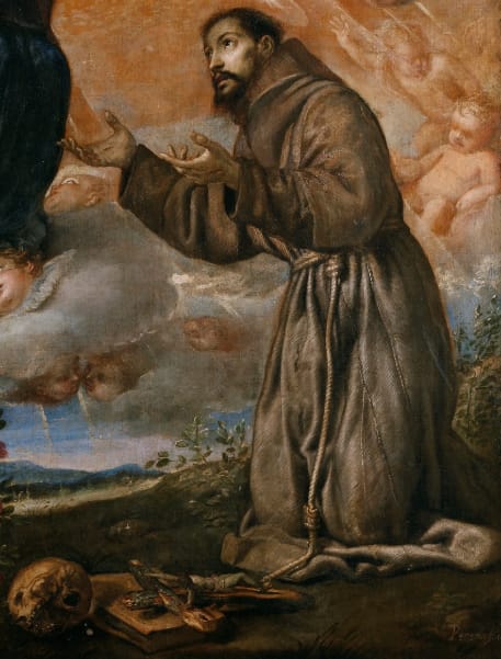 También puede ser una `referencia o cita romántica´ al precursor de la representación del Nacimiento, al tambien Santo San Francisco de Asís el patrón de los belenistas construyendo en belén el pesebre a la vez que está orando( representación dentro de otra), en ese momento esta distraído realizando la obra...