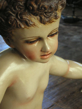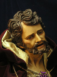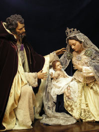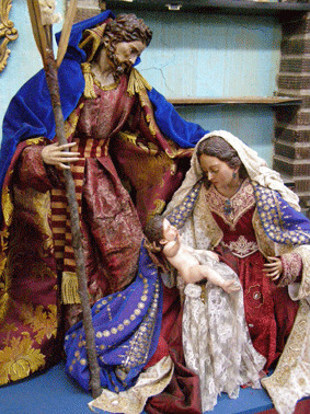 Revisando las imágenes de las estatuas, creo que lo que me parece más discordante son los ropajes. Entiendo que las vírgenes de los pasos y de adoración vayan con ropajes de lujo, diademas de brillantes, perlas, encajes, etc... y que los santos y Cristo vistan con terciopelo... pero no encaja en absoluto con el sentimiento del nacimiento humilde de Jesús... y no me refiero a una presunta "realidad" histórica, sino a la esencia de la narración evangélica. En este sentido, Trippi, a la que se ha hecho referencia (yo creo que en una referencia desacertada, puesto que las figuras no se parecen en absoluto y las dos tradiciones de donde vienen los artistas son totalmente diferentes), "viste" sus figuras de manera creíble y mucho más acertada.