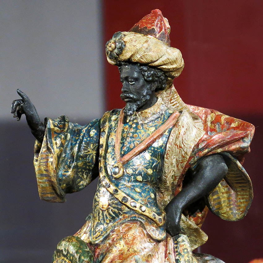 La moda de los miembros del cortejo de Gaspar (del que se desgraciadamente no se conserva al propio Rey) sigue una iconografía habitual en el siglo XVII, la vestimenta “a la turca”. Seguía modelos propios del siglo anterior en los que la presencia del “turco” era uno de los peligros acechantes de la monarquía española por el control del Mediterráneo. Por ese motivo se creó una estética de personajes que podían rayar lo grotesco, con largos bigotes y tez morena, que se acabaron convirtiendo en la estética habitual de sayones de las escenas de la Pasión de Cristo o, incluso, en receptores de golpes en muñecos fabricados para los ensayos de diferentes tornos y justas ecuestres, dando lugar al dicho popular de “ser cabeza de turco”. Sin esta concepción aparecen en el cortejo de los pajes del rey Gaspar, un nuevo contraste con los turbantes y capacetes cónicos del rey Baltasar, montado sobre un dromedario, que se acompaña por un heraldo y diferentes pajes a pie.