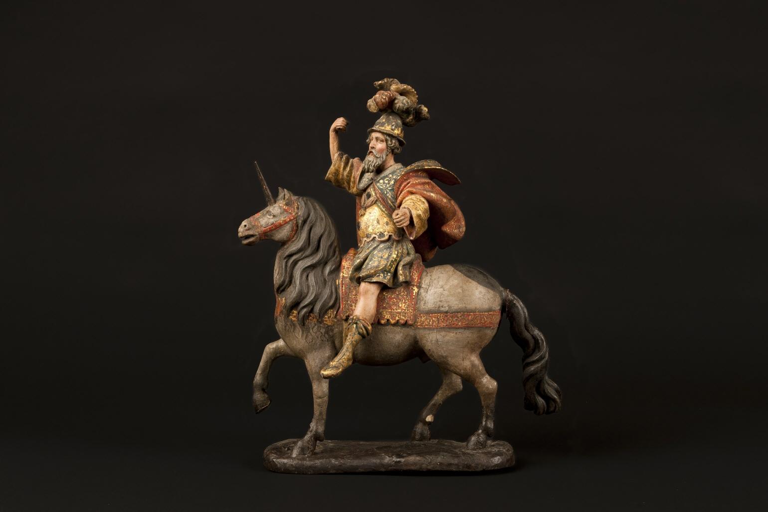 Reyes, heraldos y pajes realizados en madera de cedro con una notable policromía de punzonados, esgrafiados en oro y hasta aplicación de pequeños cristales sobre los ropajes, nos permiten imaginar una mayor riqueza en algunas piezas, que debieron tener arreos de caballería perdidos en su mayoría.