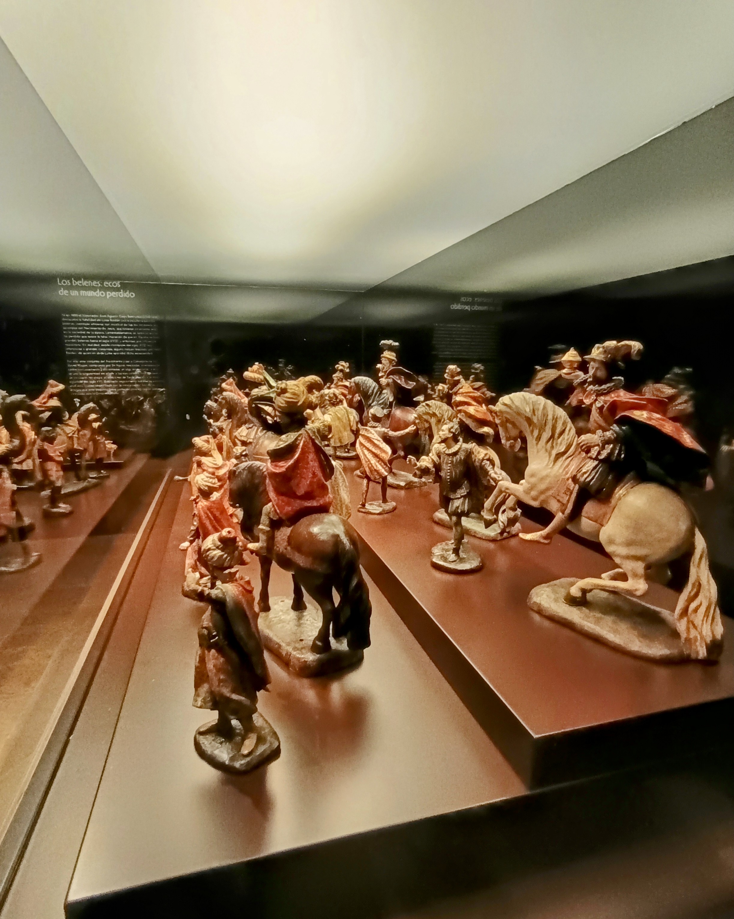 Aún en la visita a la exposición, subo la imagen de un grupo escultórico de La Roldana que, en mi opinión, es especialmente interesante por diversos motivos a nivel belenístico: Nacimiento con San Gabriel y San Miguel. Según varios estudios especializados en la obra de la escultora, este conjunto puede considerarse el único belén conservado con su rúbrica. Además, presenta una característica inédita: la adoración de los arcángeles San Gabriel y San Miguel con este último sosteniendo al Niño en sus brazos, acompañados por la figura de un buen pastor.