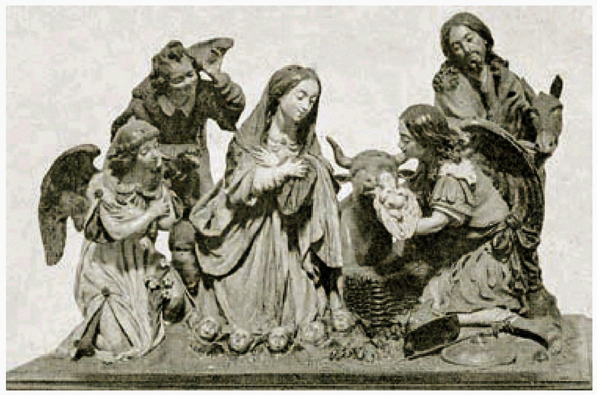 "Con la llegada de Felipe V Luisa Roldán tuvo que renovar su nombramiente como escultora real, lo cual obtuvo en octubre de 1701 tras entregar al nuevo monarca dos grupos «para demostrar algo de su habilidad»: uno del Entierro de Cristo, hoy en el MET de Nueva York, y otro del Nacimiento, que debe ser esta curiosa composición inspirada en los textos de la Mistica Ciudad de Dios de sor Maria Jesús de Ágreda, quien relata la aparición de ambos arcángeles para adorar al Niño. Lamentablemente el grupo, hoy incompleto, perdió las figuras de un joven pastor con un cordero, de san José y del buey y la mula en 1936."