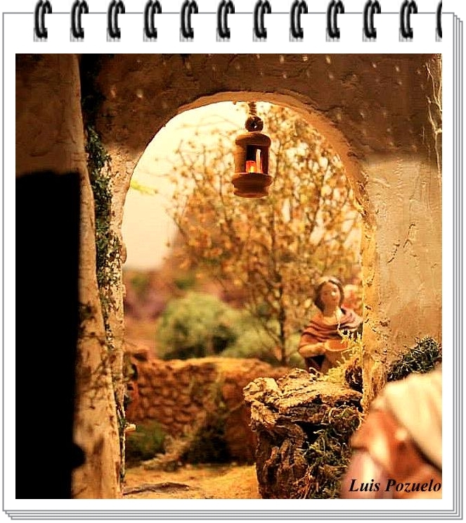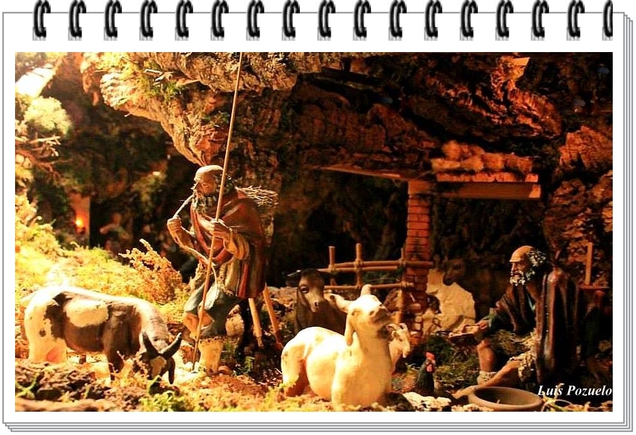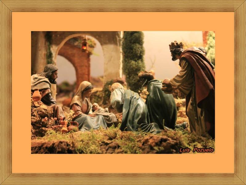 En segundo lugar, las nuevas adquisiciones de este año ( reyes adorando de Landi en 20 cm, pastor Almansa 21 cm y unas cabras de nuestro compañero Pablo, de "Animales de barro") también han contribuido, sobre todo por los reyes, para realizar un montaje distinto de los que hago habitualmente y así, por primera vez en mi vida, la Sagrada Familia ha salido de la gruta y no porque no la hubiera hecho, que ahí está con la mula y el buey y otros animales y por supuesto, con la vida y el calor que le proporcionan los pastores, sino porque la escena principal, que es la Adoración de los Reyes Magos, quedaba un tanto deplazada y claro, al considerar que este año el belén sólo presenta dicha escena, entendí que era mejor que estuvieran en un lugar más visible y más teniendo en cuenta que esa escena, San Mateo, que es el único que la describe -"...y al entrar en la casa, vieron al Niño con su madre María, y postrándose lo adoraron..."-, la ubica fuera de un establo o gruta, es por lo que me parece más lógico que estuvieran en la casa o, en este caso, en la puerta de la casa para recibirlos. Así que no hay ni Anunciación a los pastores ni por supuesto cabalgata. Me atrevería a decir que si un diorama es la representación de una escena, este año mi belén sería un diorama semiabierto.