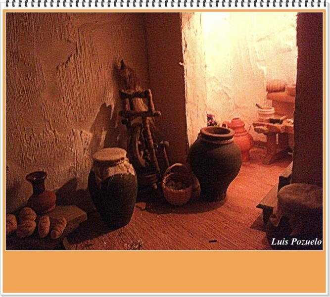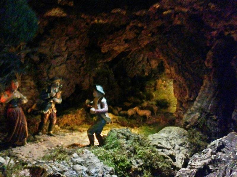 Por un lado el intentar aplicar lo que va saliendo por el Foro, donde hay magníficos tutoriales, y que esta vez ha sido el intentar aplicar las técnicas de perspectiva que tan bien nos ha explicado José Manuel Melero y la verdad, es que he disfrutado haciéndolo, sobre todo porque a pesar de que normalmente suelo aplicar la perspectiva a mis trabajos, nunca me había tomado la molestia de verificar comprobaciones de líneas e incluso, he aplicado algunos de los trucos allí expuestos, fundamentalmente en las inclinaciones de la construcción, de tal forma que algo que aisladamente puede resultar deforme e irreal, al integrarlo en el conjunto adquiere armonía y produce el efecto deseado ya que no olvidemos, al jugar con la perspectiva lo que hacemos es engañar a la vista. Y tengo que confesar que no me ha resultado nada fácil porque, como casi todos sabéis, mi estilo belenista es el popular de corcho y musgo y por tanto, he tenido que mezclar otros estilos, sobre todo en el fondo del belén, ya que sólo con corcho es complicadísimo conseguirlo. La estructura, si es que se puede apreciar (es difícili fotografiarlo), consiste en un plano, el izquierdo, con una construcción grande situada de tal forma que sus paredes laterales y sus consiguientes líneas de proyección, confluyen en un pequeño pueblo ubicado en la falda de las montañas traseras mientras que el plano derecho, lo constituye una gran montaña con grutas que va de más a menos altura y en la que sus paredes exteriores y la proyección de estas, también confluyen en ese pueblecito que en este caso, sería el punto de fuga del belén. El plano central del belén lo he dejado libre de alturas y apenas unas vallas de distintos tamaños, según la lejanía, y vegetación y figuras de mayor a menor para intentar conseguir ese efecto.