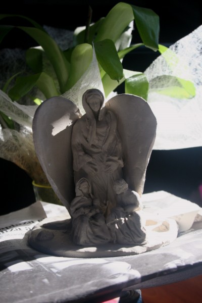 Hola,os muestro otra pequeña obra..un angel de 11 cm cobijando al misterio de 6 cm.