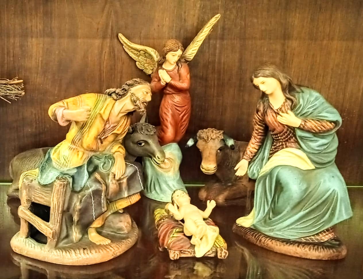 Si se trata de figuras sueltas el juego de miradas lo tienes que crear tú, no viene en un manual de instrucciones en la caja con las figuras del Nacimiento, por lo tanto ya puedes girar al Niño Jesús y dirigir su mirada hacia San José, y retirar el ángel hacia un lado para que no interrumpa el bucle que forma el triángulo, ¡ah! Los ojos de los dos pequeños animalitos deformes (RAE desproporcionado o irregular en la forma.) que aparecen por detrás no se les debe ver la esclerótica (el blanco), en la foto no se donde están mirando, deberás girarlos para que el ojo humanizado mira al Niño, quizás de esta manera consigas enfatizar más las fuerzas de tensión conseguidas con las respectivas miradas.