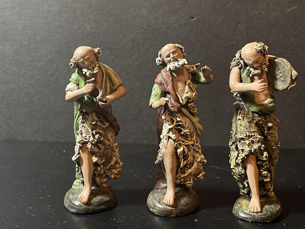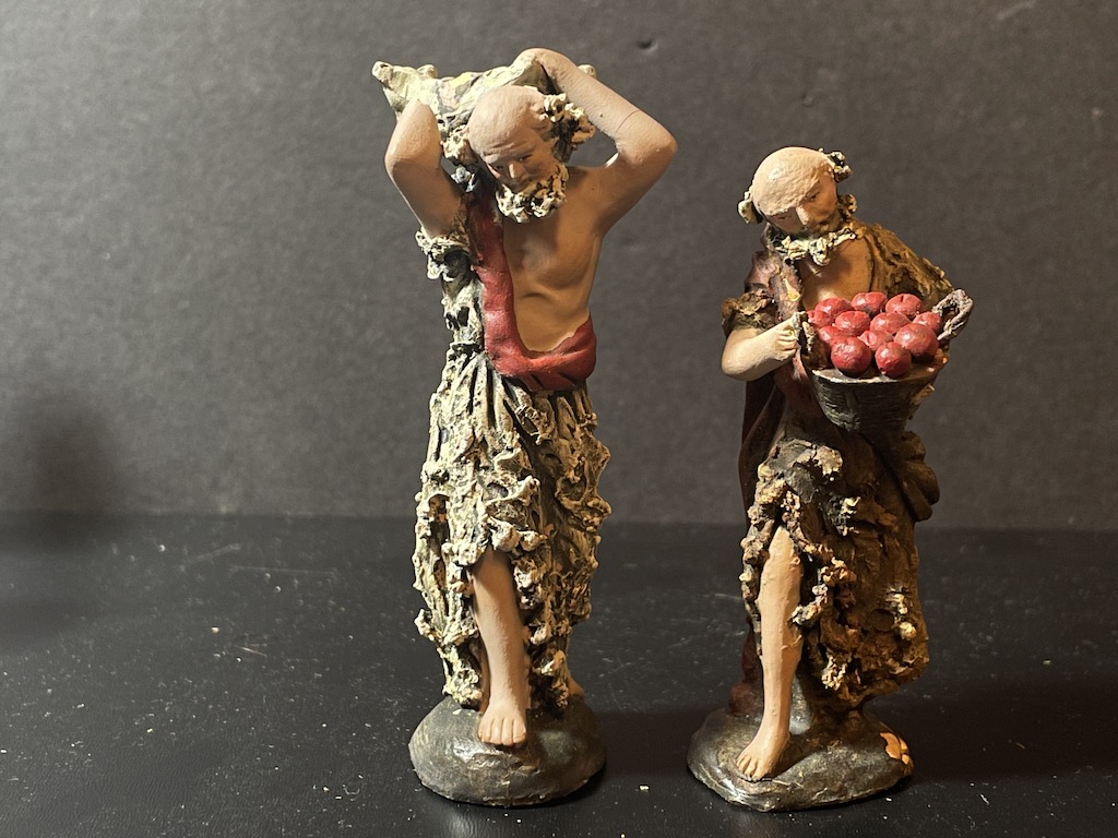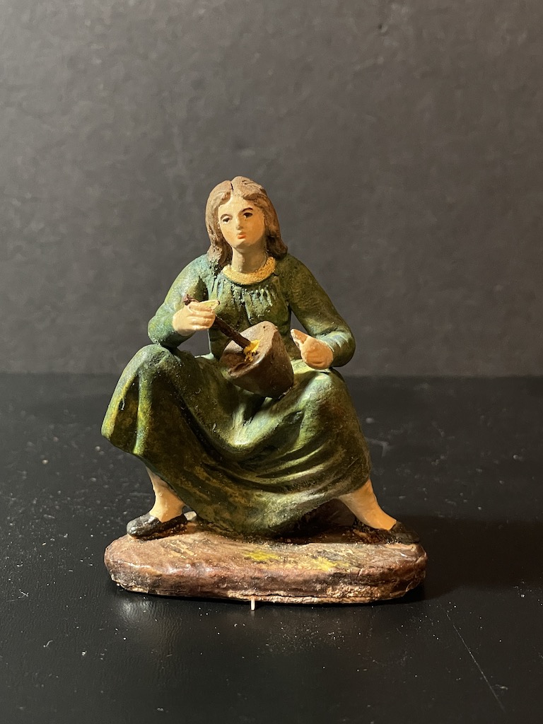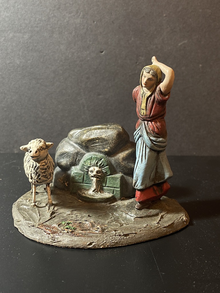 Adquiridas como fueron a muy primeros de los 80 debe ser como tú dices Tunito. Ahora os dejo otras de la misma época que se corresponde con el grupo de la Anunciación a los pastores, también con el sello en la base roja. Me llama la atención que el entelado es algo menos aparatoso de lo habitual. Aparte están también dos piezas más, una con una olla al fuego y otra con una botella y un zurrón con viandas. Posiblemente el conjunto tenía otro pastor más sentado ... que de un año para otro desapareció, o eso creo recordar ¿a alguien le suena haber visto este conjunto en catálogo o por algún sitio?