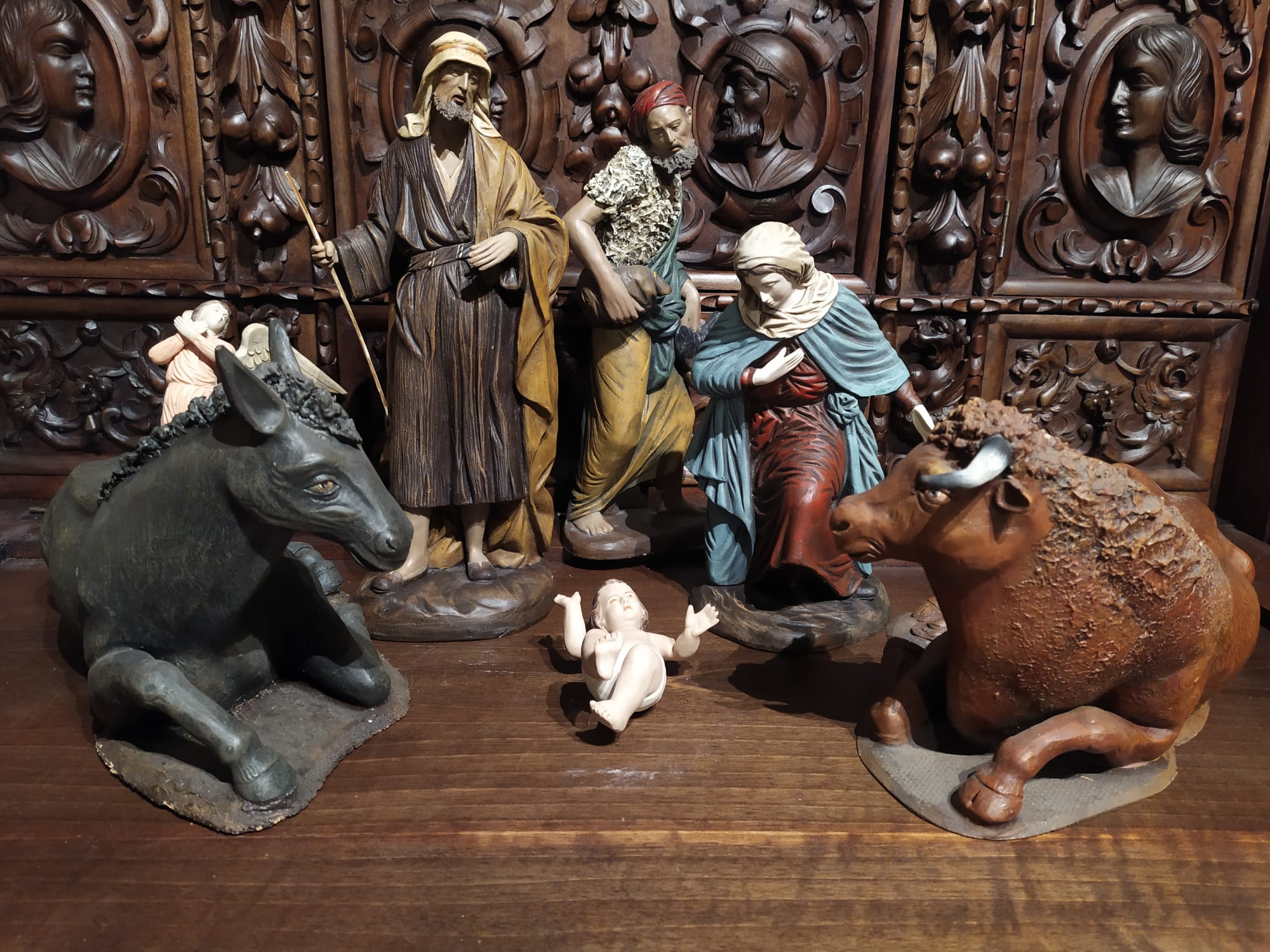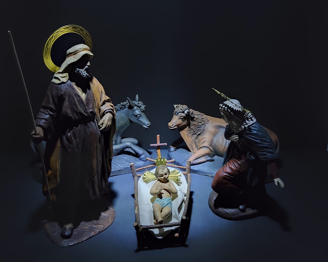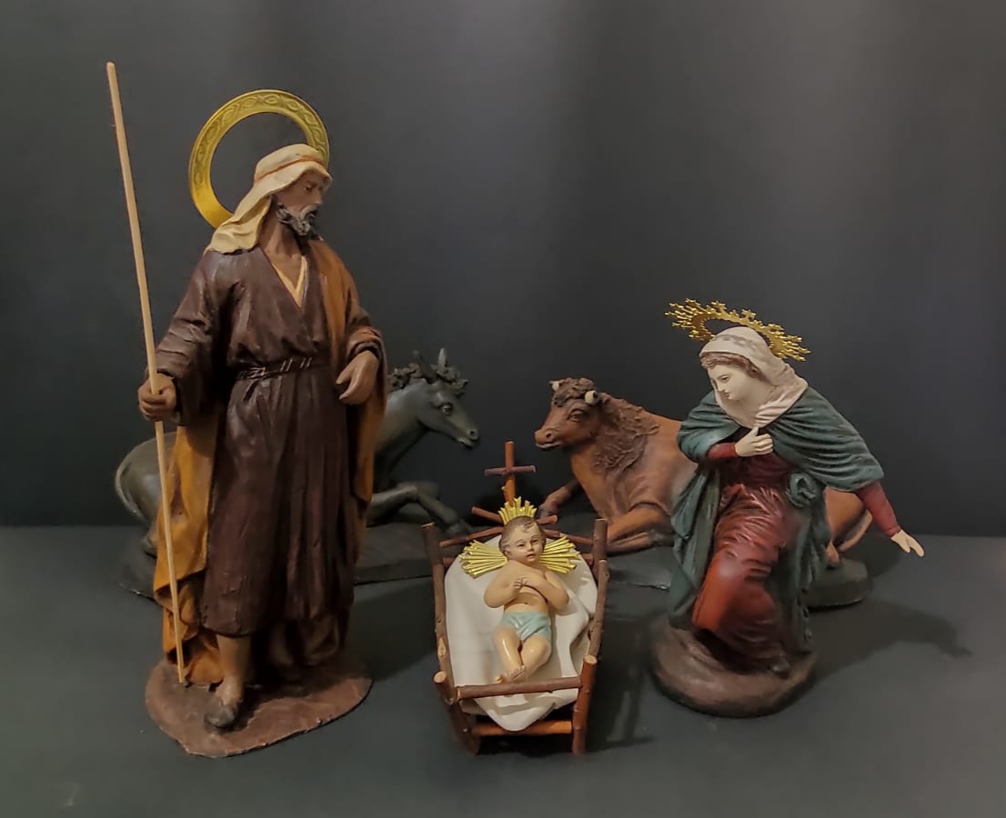 Ajunto fotografías de un misterio con figuras de 21 de San José y la Virgen. Los animales son de 17. Falta en el conjunto el Ángel. Van aderezadas con aureolas y potencias. La idea era acompañar a la Virgen también con media luna. Es el misterio más común en la producción de Ortigas.