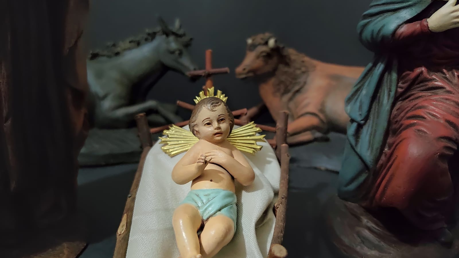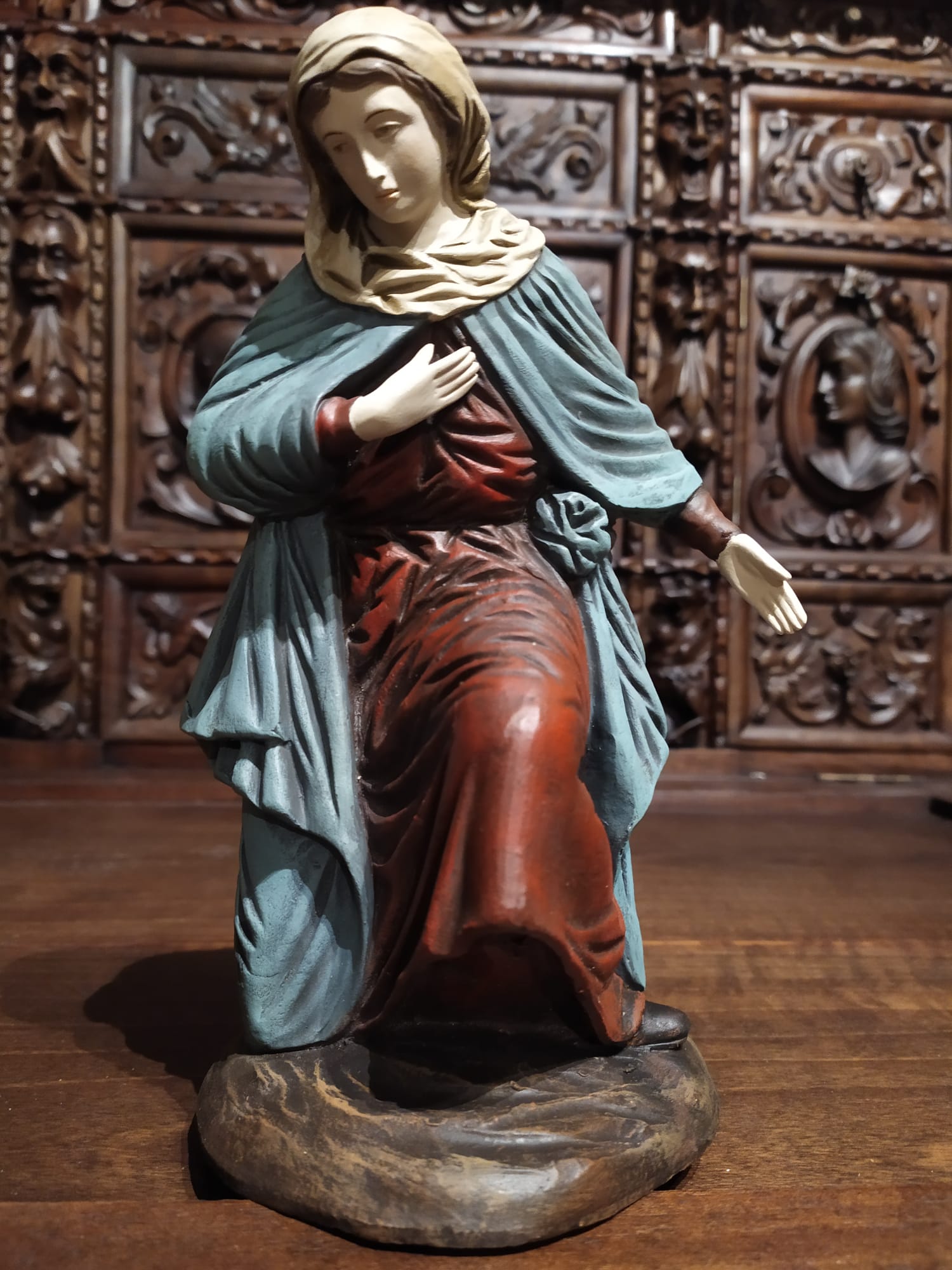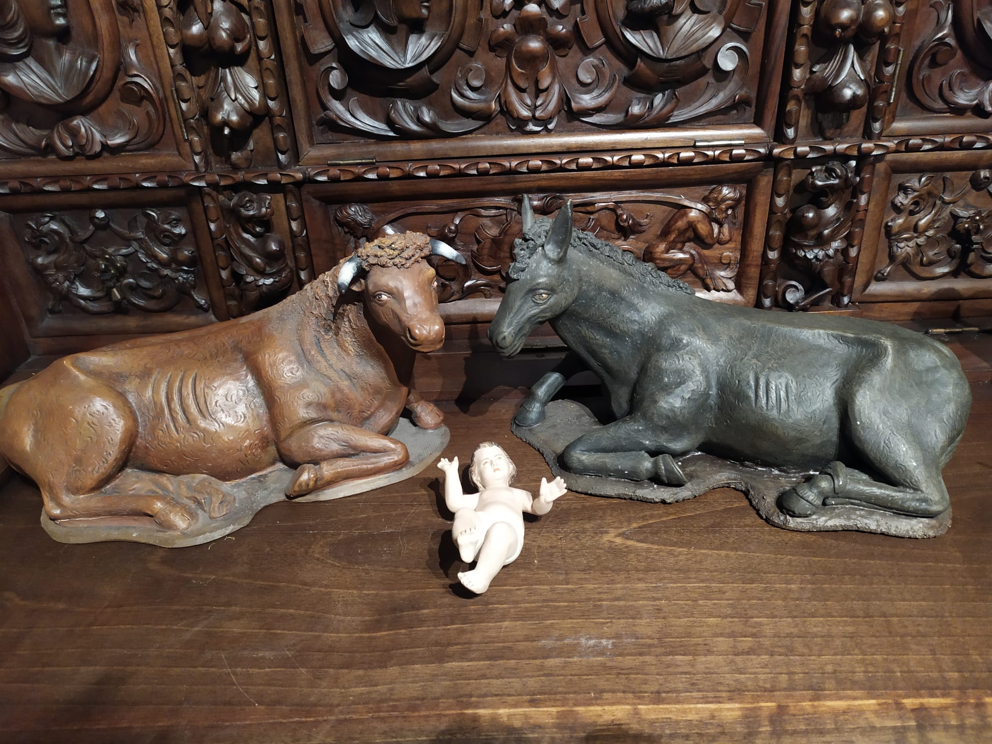 Ajunto fotografías de un misterio con figuras de 21 de San José y la Virgen. Los animales son de 17. Falta en el conjunto el Ángel. Van aderezadas con aureolas y potencias. La idea era acompañar a la Virgen también con media luna. Es el misterio más común en la producción de Ortigas.