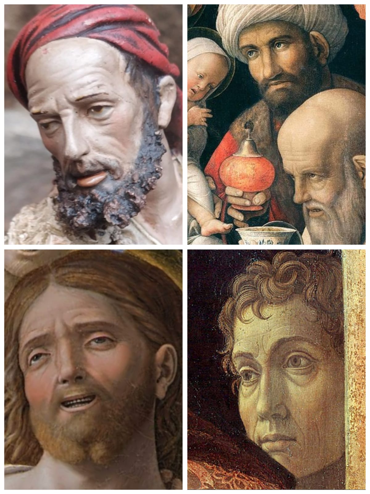 Comparativa del rostro de la figura del pastor con otros de fragmentos de pinturas de Andrea Mantegna .