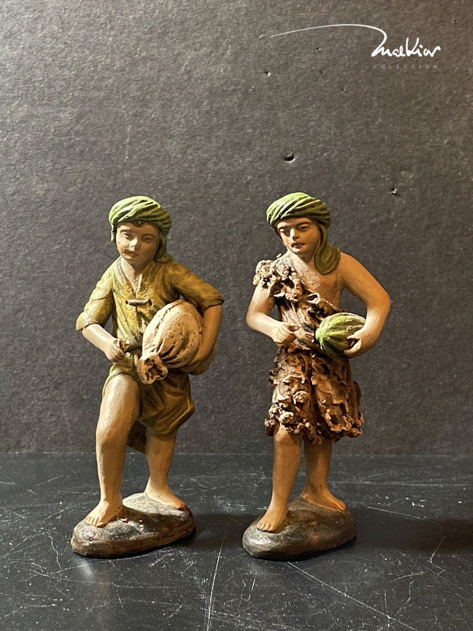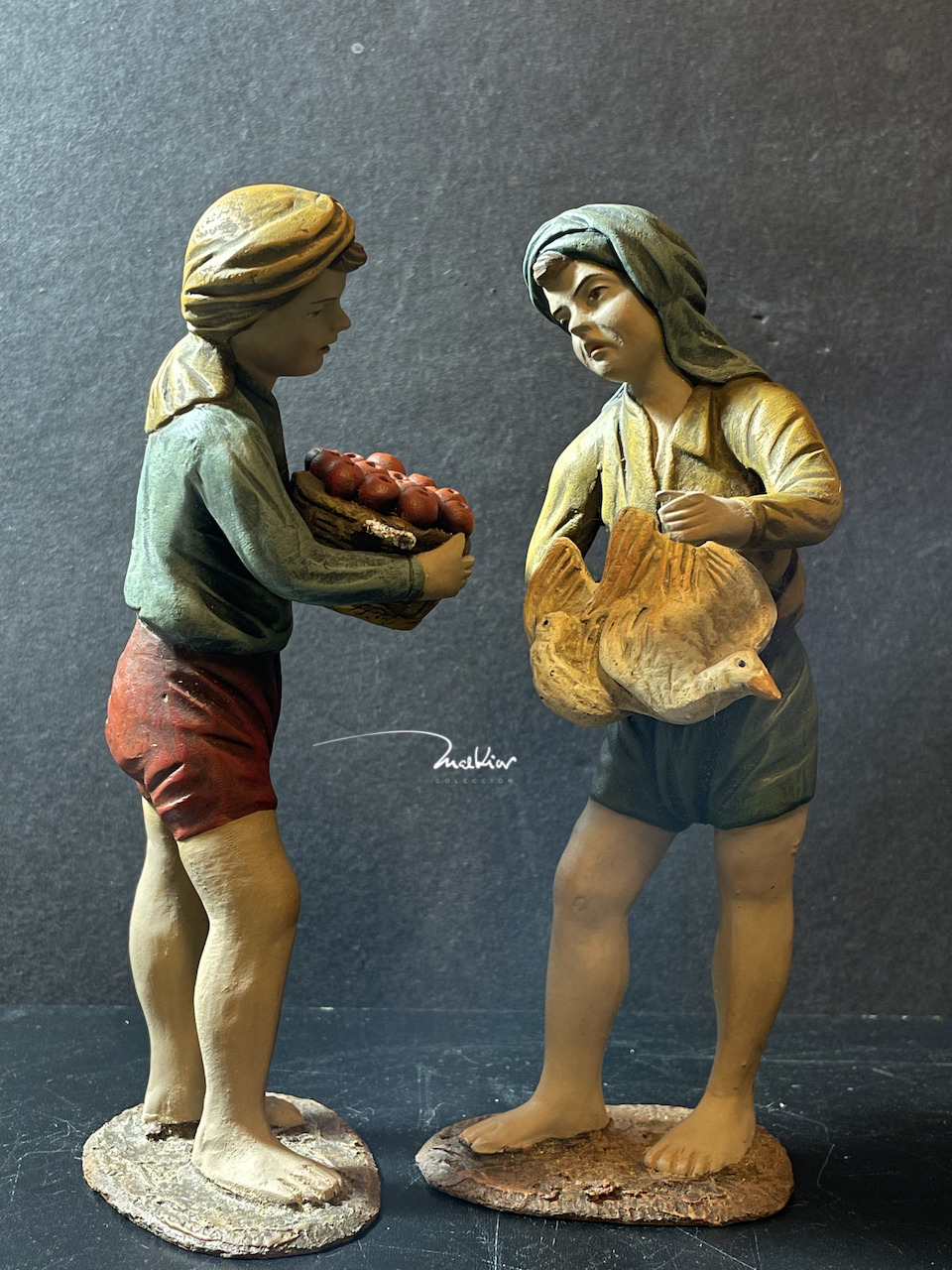 También dos niños, sellados en bases de madera pintadas en amarillo, con la numeración 704.17, que aunque creadas para figuras de 17, pueden ser perfectamente para figuras de 21/25. Dos adolescentes oferentes, configurados partiendo del mismo molde, con alguna variación en la postura de las manos y la policromía... de nuevo la versatilidad del molde en las figuras de Ortigas se hace patente tanto en los que portan la canasta de frutas y las aves, como los dos anteriores. Figuras que dan mucho juego para componer alguna escena para el Belén Malkior 2022... (primeros apuntes, como diría el compadre... suceptibles también de narrar un cuento... ¿quién sabe?)