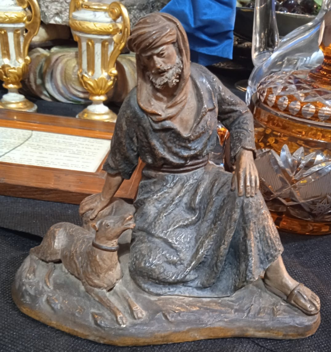 Esta otra del mismo molde por pátina/policromía y calidad en el detalle (rostro, manos, ropajes...) es mas antigua aún, tiene el perro y una sutil diferencia en la posición de la cabeza que la hace interesante para el estudio de las variaciones de los moldes de Ortigas y las diferentes 'manos' del taller...