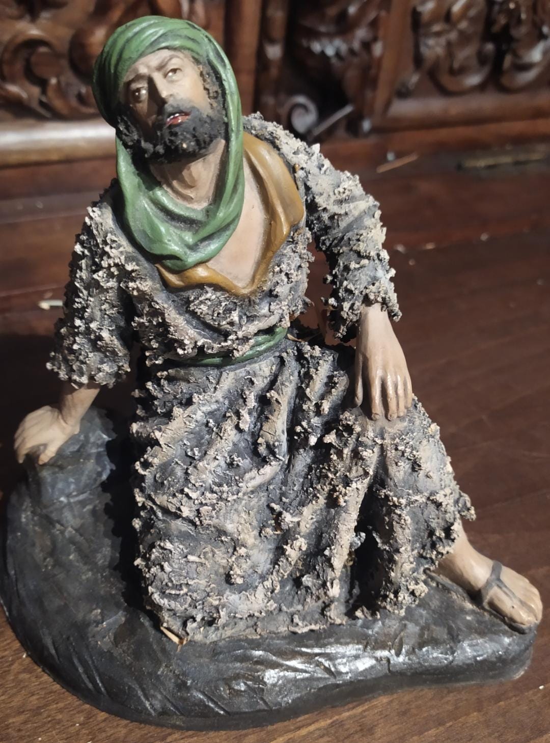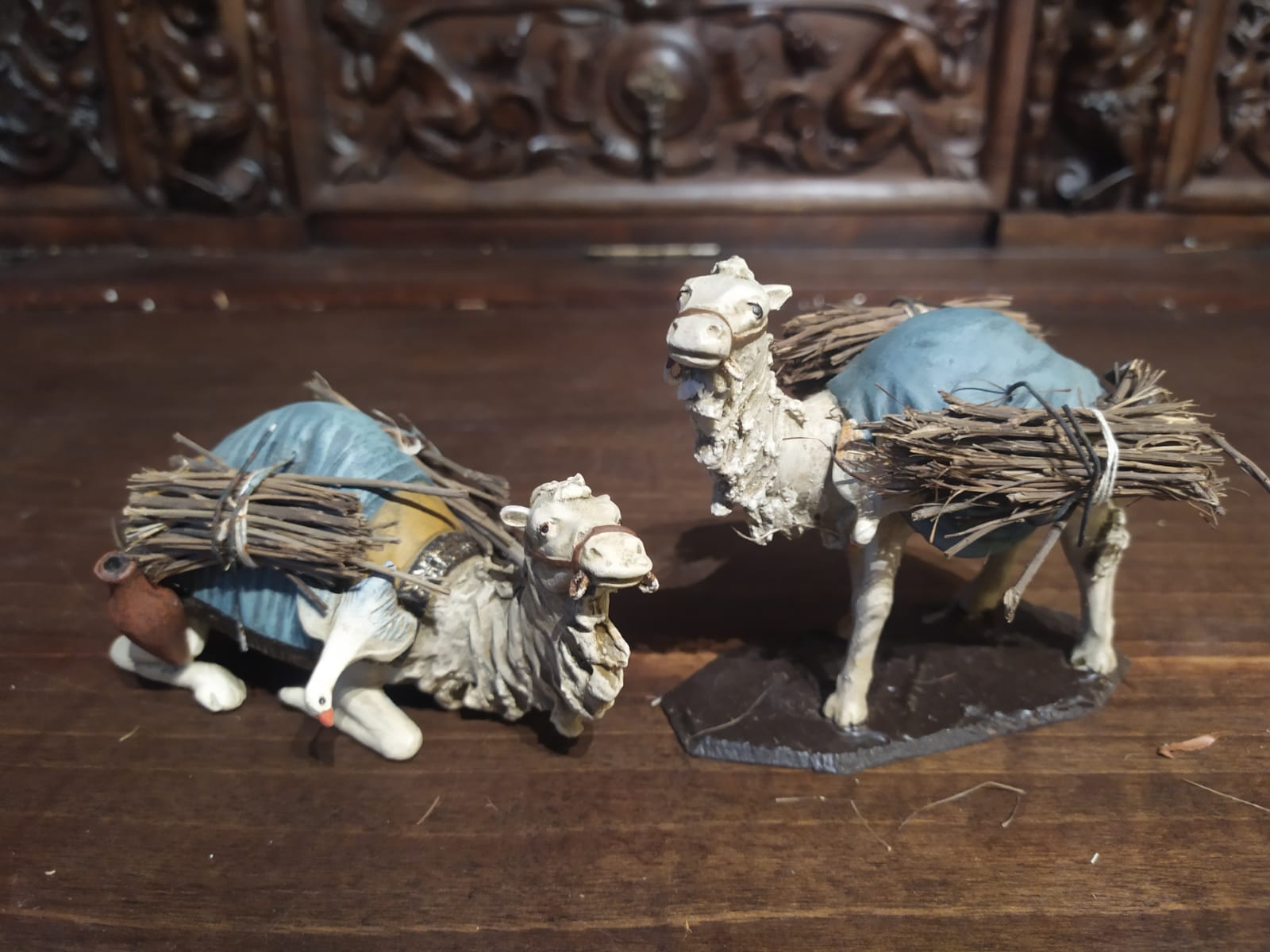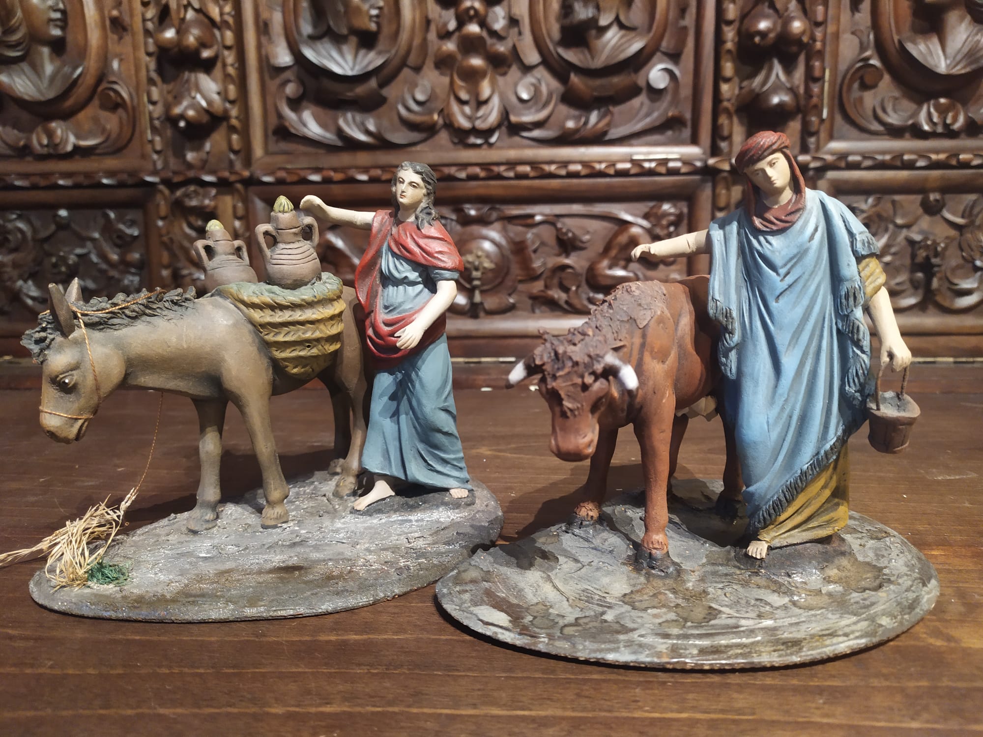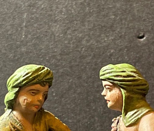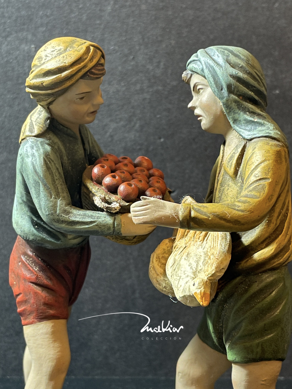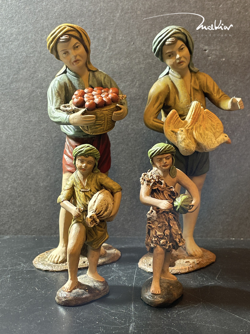También dos niños, sellados en bases de madera pintadas en amarillo, con la numeración 704.17, que aunque creadas para figuras de 17, pueden ser perfectamente para figuras de 21/25. Dos adolescentes oferentes, configurados partiendo del mismo molde, con alguna variación en la postura de las manos y la policromía... de nuevo la versatilidad del molde en las figuras de Ortigas se hace patente tanto en los que portan la canasta de frutas y las aves, como los dos anteriores. Figuras que dan mucho juego para componer alguna escena para el Belén Malkior 2022... (primeros apuntes, como diría el compadre... suceptibles también de narrar un cuento... ¿quién sabe?)