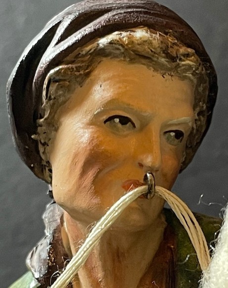 Finalmente dos pastores de la serie de 21. Una lavandera, sellada en base de madera 707.21 con una policromía particular en cuanto a la técnica dentro de la producción de los talleres de Ortigas. Fijaros en el detalle de la arandelilla que lelva en los labios para simular que agarra con la boca lo que va tejiendo...