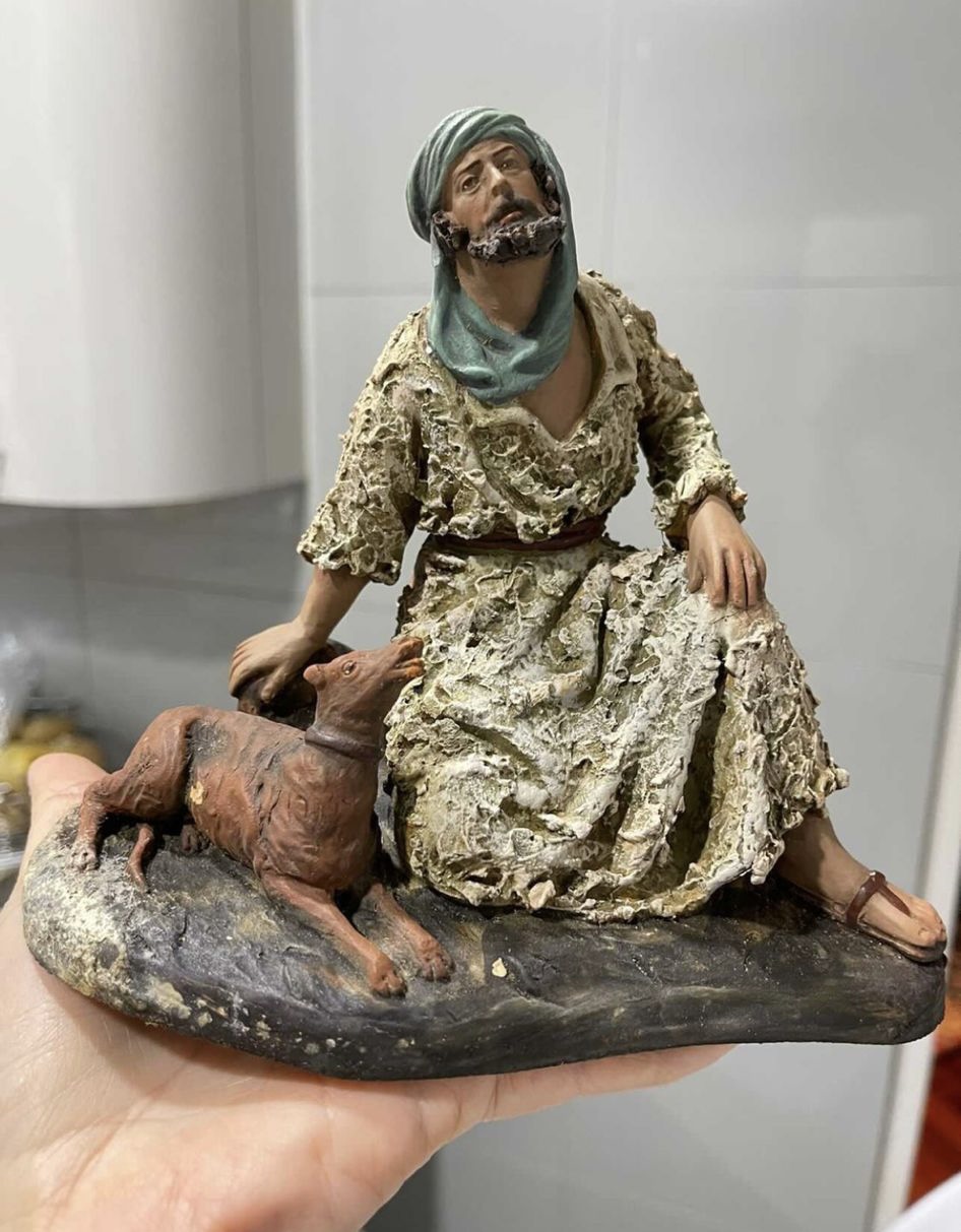 Esta otra del mismo molde por pátina/policromía y calidad en el detalle (rostro, manos, ropajes...) es mas antigua aún, tiene el perro y una sutil diferencia en la posición de la cabeza que la hace interesante para el estudio de las variaciones de los moldes de Ortigas y las diferentes 'manos' del taller...