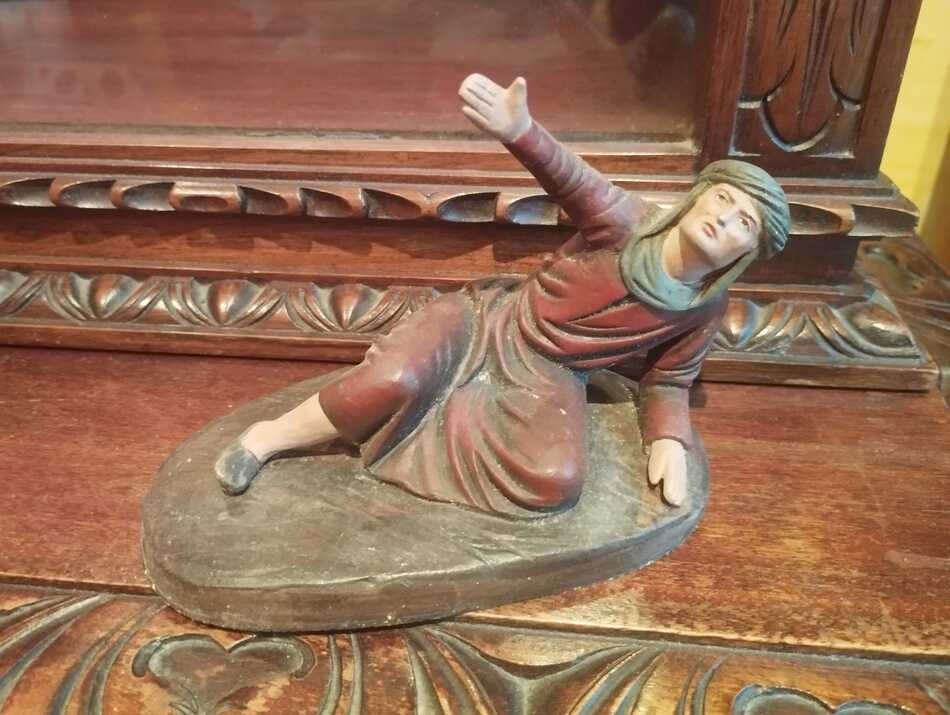 Buenas noches. Soy nuevo en este foro. Muchas gracias por aceptarme. Bueno, el caso es que la Navidad pasada me encontré al lado de un contenedor de basura una caja llena de figuras de belén de barro y plástico. Las de barro son de la casa Ortigas, y como podéis imaginar la mayoría tienen piernas y brazos amputados, alguna mano, vamos que parece que vengan de una batalla. Estos días de verano me he decidido a restaurarlas y montar un belén en casa por primera vez... Tengo una figura a la que le falta un brazo. Empezé con un muñón pero paré al no tener claro como continuar. En su base indica que es de un grupo (704) y he estado buscando en este hilo para ver si por casualidad aparecía en alguna imagen, pero no ha habido suerte. Adjuno algunas imágenes. ¿Alguien la tiene, o sabría decirme en qué posición habría que rehacerle el brazo? Creo que debería ser flexionado hacia delante, como apoyándose en un bastón.