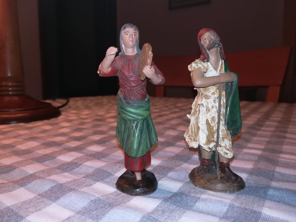 Mi 1ª intervención aquí, foro muy interesante. Supongo que para todo el mundo, las buenas cosas aprendidas quedan para siempre: Este es el Belén que mis padres ponían desde que tengo algún recuerdo, y por eso hoy lo aprecio más que nunca, e incluso me obsesiono en conseguirlo igual. En su momento yo lo definía como figuras “góticas”-eso me parecían- o “achinadas” antes que infantiles, ya que me parecían “serias”, y había visto otras mucho más infantiles, a menudo de plástico. Son sin duda las del post #352139 (4/7/2012) de Jeremfer (impresionante erudito)<31656074.JPG, 31656074_10318083.JPG>, aunque no sé por qué aquellas no tienen color. Hará unos 7-8 años, quizás más, me pareció ver que se vendían ocasionalmente en el centro de Madrid, en una tienda (aunque era el mes de los puestos de la Plaza Mayor, sé que era muy cerca pero no en ellos). Debían ser excedentes, de inventario, o limpieza de tienda…. Recuerdo que tenían la caja amarilla que aparece en <Imagen1.jpg> del mismo post, menos verdosa de lo que parece aquí. Esta caja debía ser común a varios tipos de figuras. Siempre he lamentado no volverlas a adquirir entonces.