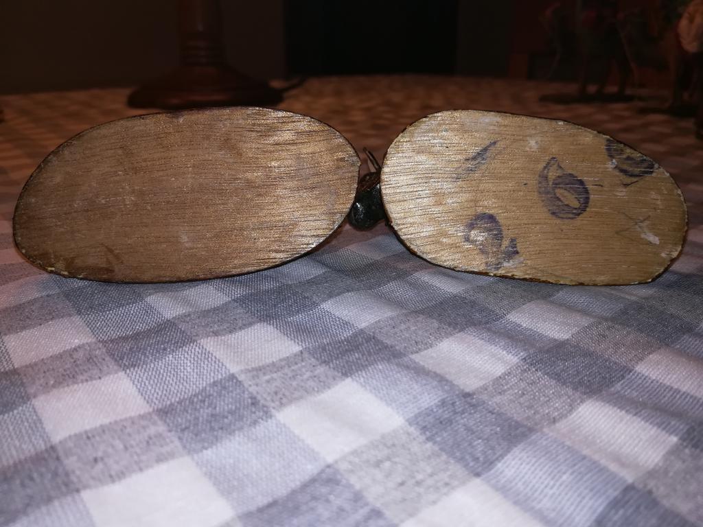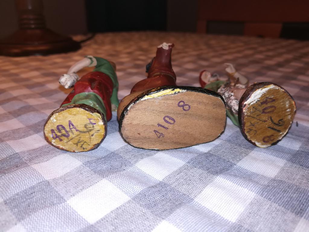 Hace tres años, ante la imposibilidad de encontrarlas, restauré las de mis padres, que son las que muestro en las fotos. No hizo falta mucho, porque estaban en muy buen estado: Baltasar estaba decapitado, los nimbos y el cayado de San José, el ángel tenía las alas rotas y se las hice más cortas (precisamente éste viene bien ilustrado en la caja amarilla mencionada de <Imagen1.jpg>) y la mula simplemente la hice nueva, inventada sin referencias (qué pena no haber visto las fotos de este foro), pues hace años que se perdió (por eso la oculto bastante en las fotos).