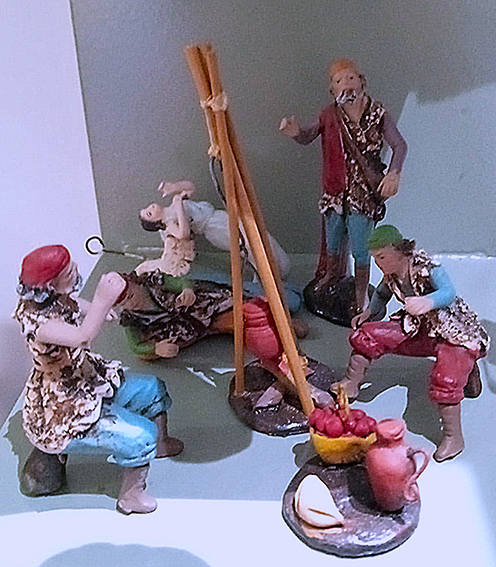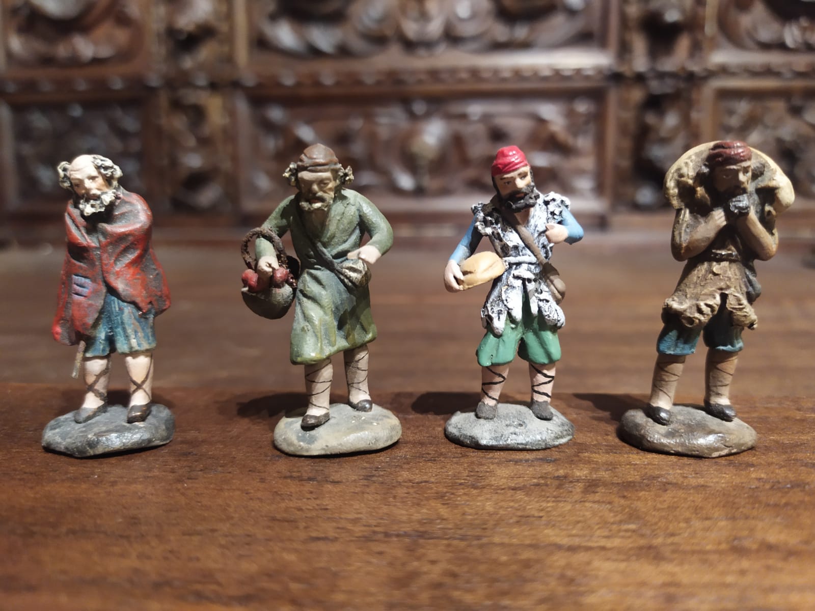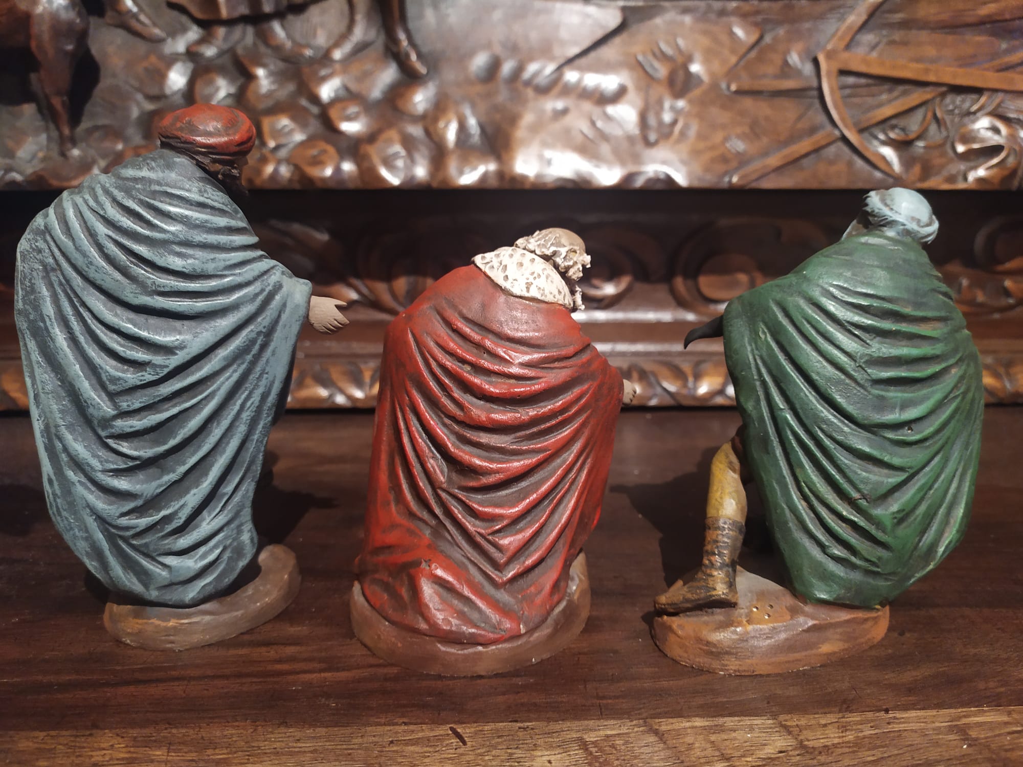 Son de la serie de 21, puede que tres de ellos formaran parte del mismo grupo de la anunciación a los pastores; se ven que son de épocas compositivas distintas, por las bases... pero fuera lo que fuere, en este formato de 21, las figuras de Ortigas (bueno, sus artesanos figuristas) ganan mucho protagonismo las características propias del taller. T exturas, escorzos, movimientos contenidos, miradas con ojos que brillan, quietud contenida, fuerza bruta, instantes congelados, figuras que narran escenas, escenas que han narrado muchas navidades.