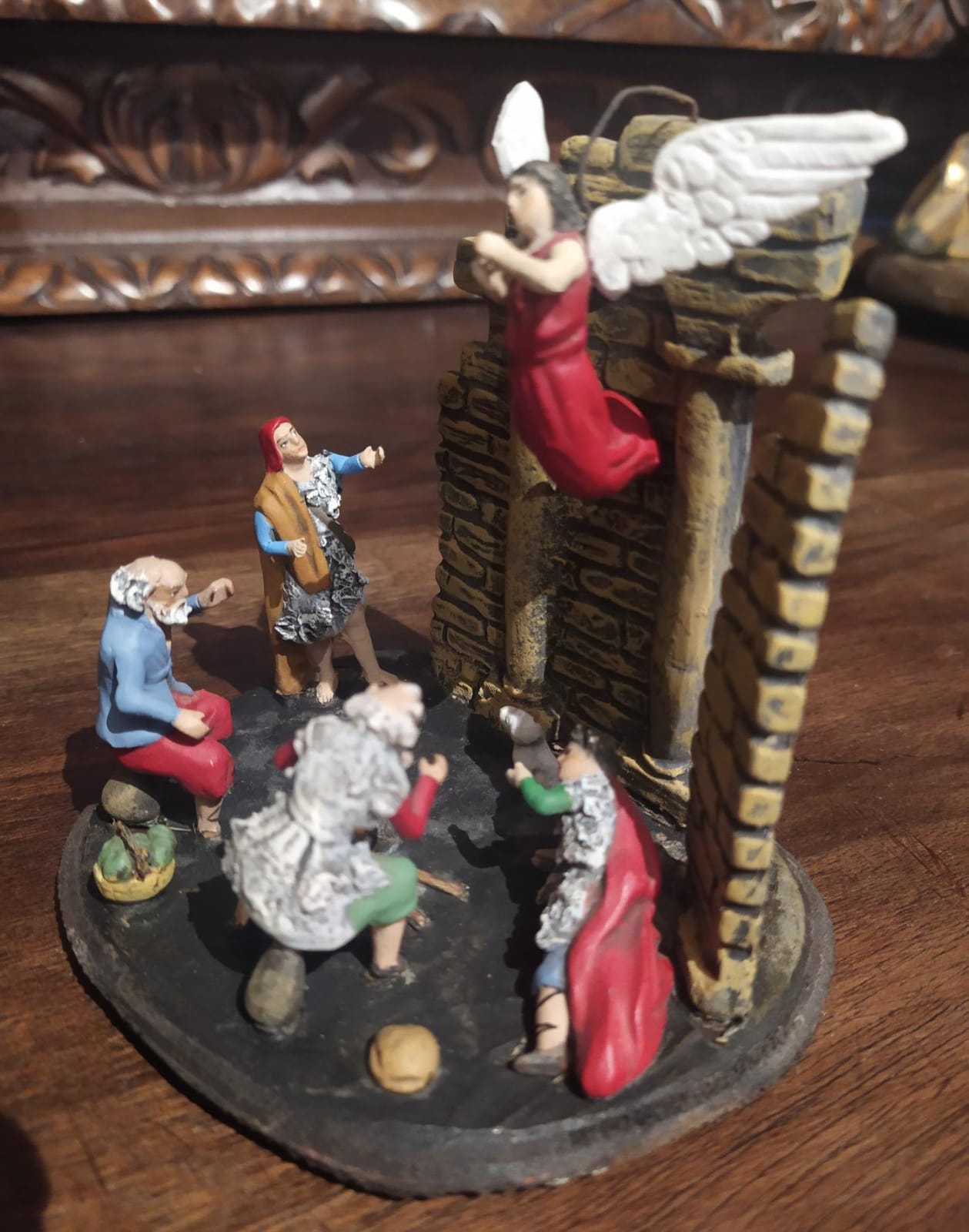 En segundo lugar, la miniatura que nos presenta Tunito, es un pequeño espacio de preciosos detalles, con una minuciosidad muy cuidada... gracias por compartirla... fijate que ha llevado a Félix a descubrir que contaba con unas figuras de Ortigas sin sellar en casa... posiblemente formaran parte de la tapadera de una olla o vasija, he visto algunas de formato mediano, que en el interior albergaba el Misterio con pastores y Reyes adoradores y en la tapa se resolvía la decoración con la escena de la anunciación...