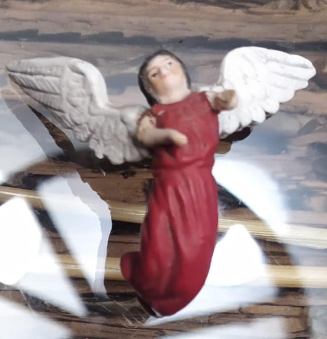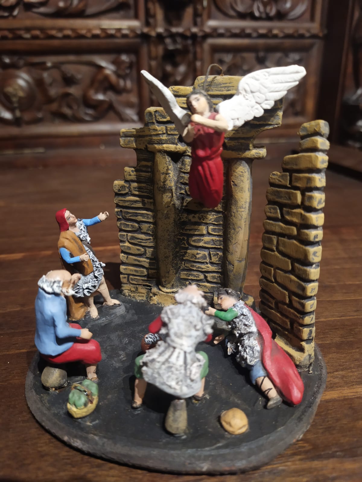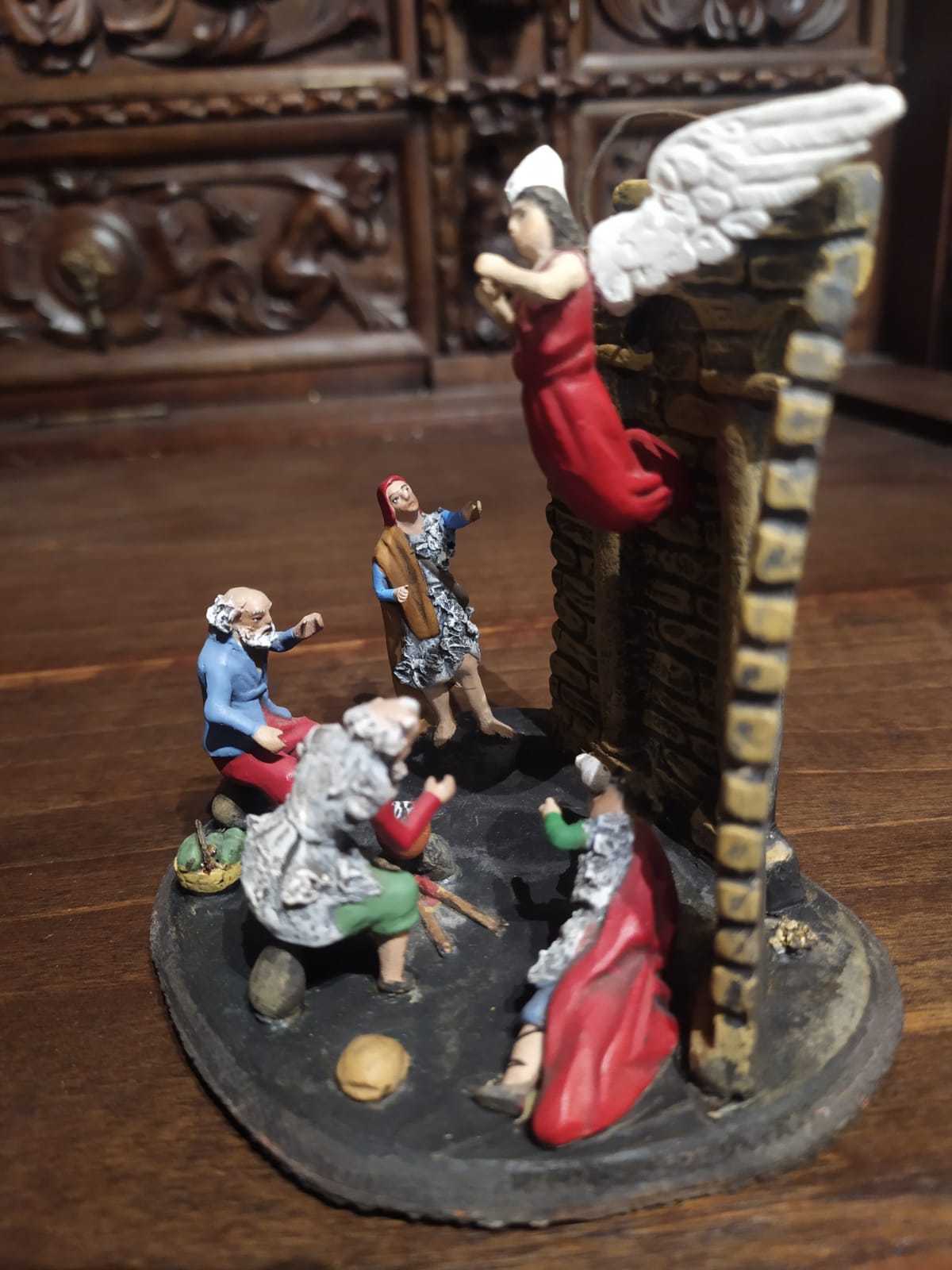 En segundo lugar, la miniatura que nos presenta Tunito, es un pequeño espacio de preciosos detalles, con una minuciosidad muy cuidada... gracias por compartirla... fijate que ha llevado a Félix a descubrir que contaba con unas figuras de Ortigas sin sellar en casa... posiblemente formaran parte de la tapadera de una olla o vasija, he visto algunas de formato mediano, que en el interior albergaba el Misterio con pastores y Reyes adoradores y en la tapa se resolvía la decoración con la escena de la anunciación...