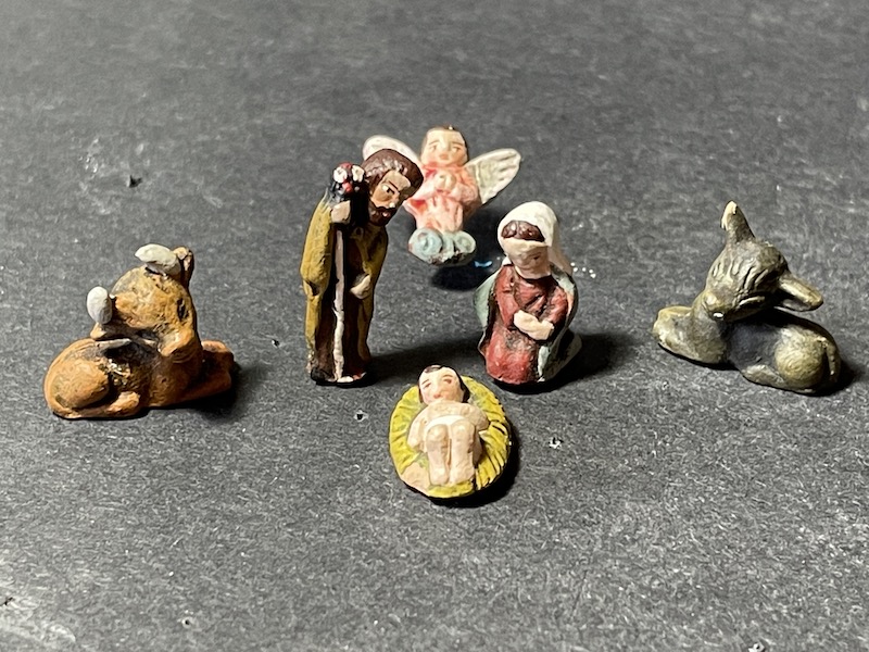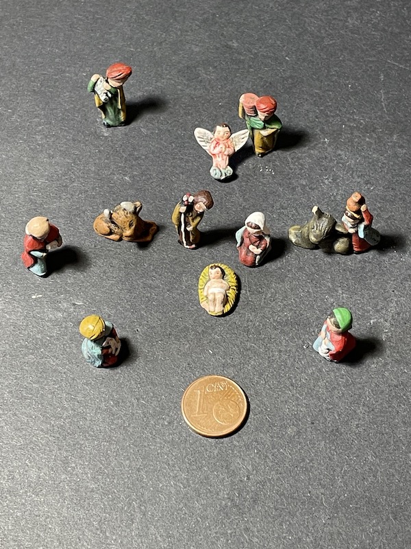 IMG_1399.JPG (135KB - 112 descargas)La Colección Malkior va creciendo... aunque sea gota a gota... aunque el tamaño sea pequeño. Os presento un juego de figuras de pequeño formato (2cm) que consta de Misterio completo y un juego de seis pastores, cuatro en pie y dos adorando. Está en muy buen estado (creo que un pequeño desconchón en la oreja de la mula), la minuicosidad es increible, está cuidado cada detalle en el modelado y la policromía... y los ojos brillan.