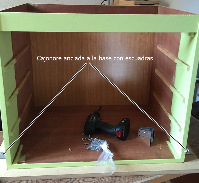 Primer apartado. El soporte de la mesa, lo he realizado con dos tableros de DM de 19 mm y una cajonera vieja repintada.