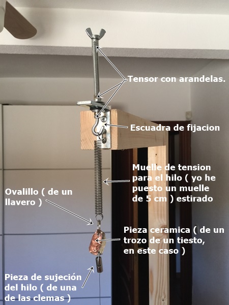 Tercer apartado. El brazo de sujeción del hilo de corte y la forma de fijarlo en ambos extremos. Aquí he hecho alguna variación respecto de la máquina de Lola, seguro que se puede mejorar el sistema que a mi se me ha ocurrido.