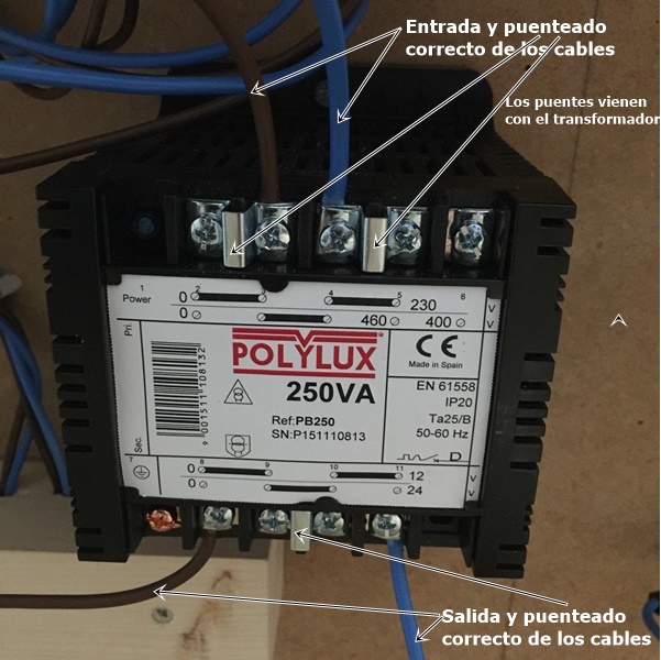Cuarto apartado. La alimentación eléctrica del hilo de nicrom de 0,5. Esto me llevo mucho tiempo dado mi escaso conocimiento en temas de electricidad, con lo cual es posible que no lo sepa ni expresar correctamente. Se realiza con un transformador de 230 con salida a 24 v. En las fotos creo que se ve bastante correctamente la idea.