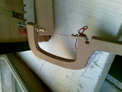 El invento es muy sencillo y práctico, se ponen unas chapas cortadas con laser en una prensa de madera sujetandoo aprisionando una plancha de poliestirono -del duro- y con el arco de sierra se pasa apoyando el hilo de nicrón sobre el borde de las chapa. El secreto está en que las chapas estén cortados formando una "cordillera" como si pusieras monedas de 2 centimos y de cinco centimos alternandolas, en la otra chapa se hace lo mismo pero ponieno enfrente de la de 2 una de 5. De esta forma las teljas van de más ancho a menos y la siguiente de menos a más.