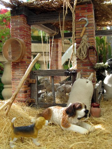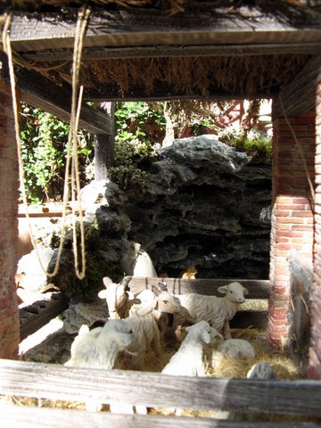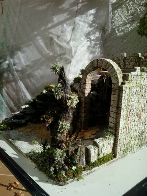 También realizado del mismo modo que los anteriores con cortezas de pino para la cueva y porexpan extruido para realizar las tres columnas de ladrillo y las vigas de madera que albergan una paridera de ovejas y cabras.