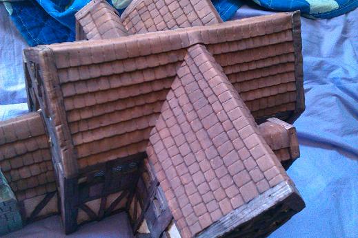 Y para hacer los tejados de las viviendas, ya sean de tejas o de paja, estoy utilizando este material, cortándolo a tiras y marcándolo con ayuda de un rotulador de punta fina o la punta de un bisturí. También valdría un cepillo de alambre para el caso de los techos de paja. Para envejecerlos, basta con mancharlos con nogalina, un tinte para maderas que se disuelve en agua.