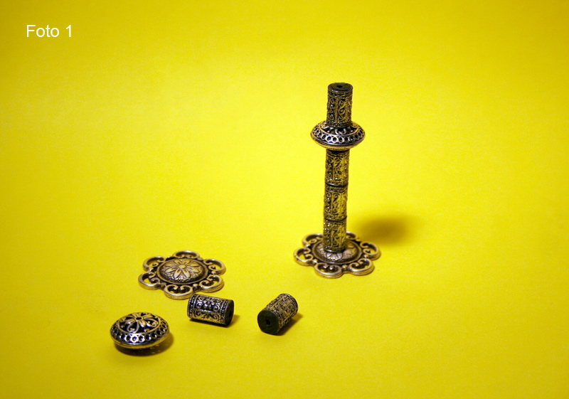 Foto 1 He elegido un abalorio plano que hará de base para la menorá. Para hacer el mástil del candelabro he utilizado abalorios cilíndricos que son muy apañados para eso. Para darle un poco de gracia y que no sea un mástil completamente recto, he intercalado un abalorio ovalado. Se pegan con cianocrilato (tipo loctite).