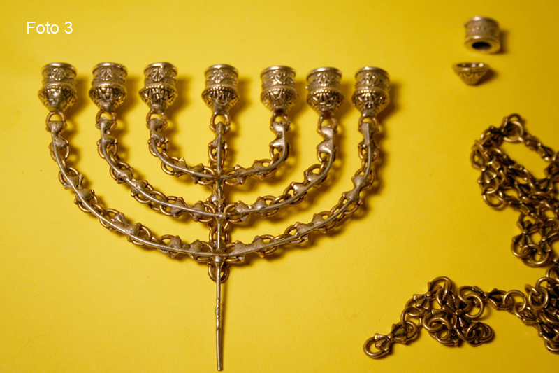 Fotos 4 y 5 Solo queda pegar los brazos al mástil y acoplarle 7 velas para lograr el efecto completo. Las velas suelen estar hechas por capas. Con un cuter, incluso solo con las manos, vamos quitando capitas hasta que tengamos el grosor de vela que encaje en los brazos. Se derrite un poco la vela para mayor realismo y ya tenemos una preciosa menorá que dejará con la boca abierta a cuantos la contemplen.
