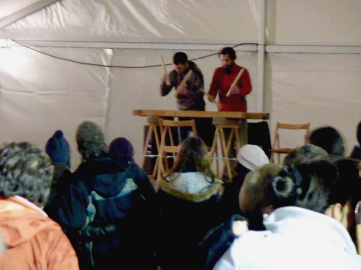 Por la tarde nos han amenizado con un recital de txalaparta, que es un instrumento de percusión tradicional vasco compuesto de dos soportes sobre los que van posados varios tablones de diferentes maderas (castaño, fresno etc.,) sobre los que los txalapartaris golpean con dos palos consiguiendo unos sonidos peculiares
