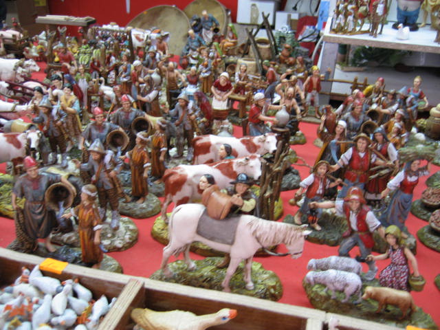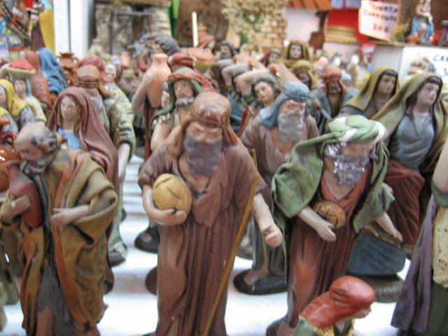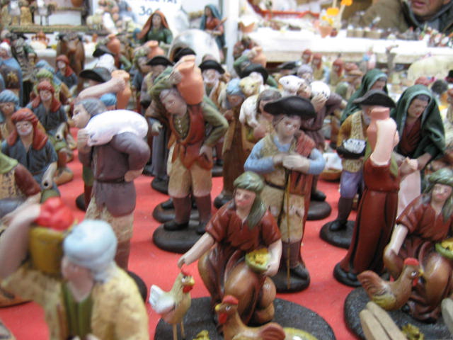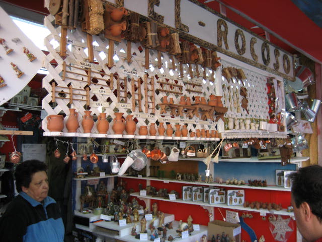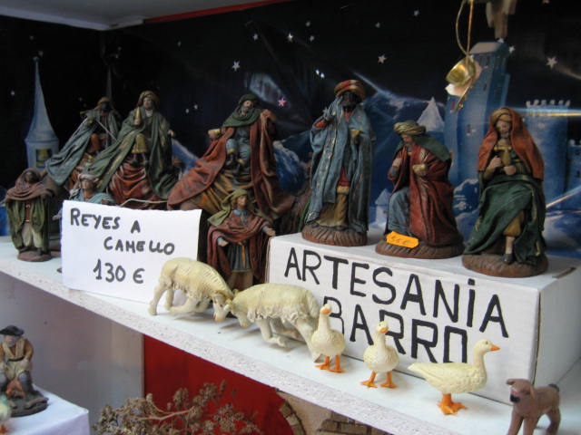 Me desilusioné completamente nada más llegar. De la lista de tiendas que circulan por el web y por la web no encontré ni la mitad. Es más, ni las propias tiendas de las calles en las que según algunos foreros podríamos encontrar esas tiendas las conocen. En la P. Mayor, lo primero que ví (y desde bien lejos) fueron los tenderetes para celebrar los Santos Inocentes el próximo 28. Máscaras, pelucas y una infinidad de artículos de broma. Los puestos con pastores eran notoriamente inferiores al resto, y la mercancía repetitiva (diría que un 90% de los tenderetes vendían figuras tipo murcianas enteladas que a mi, personalmente y perdonadme, no me gustan). Me salió más a cuenta patearme toda la ciudad y comprar 8 ovejas de barro en una tiendecita de barrio; además de ser más baratas eran mucho más bonitas.