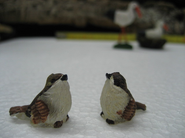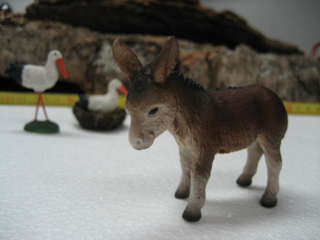 Tienen algunas figuritas de animales y humanos en plástico y resina de la casa Puig y Olivier que merecen la pena.Tanto es así que como muestra compré unos pajaritos y unas cigüeñas que os pongo en unas fotos.También compré en otra tienda, un burrito de la marca Scheiner? que se puede acoplar facilmente.Pongo una figura de la colección de El Prado para que sirva de muestra de tamaño.