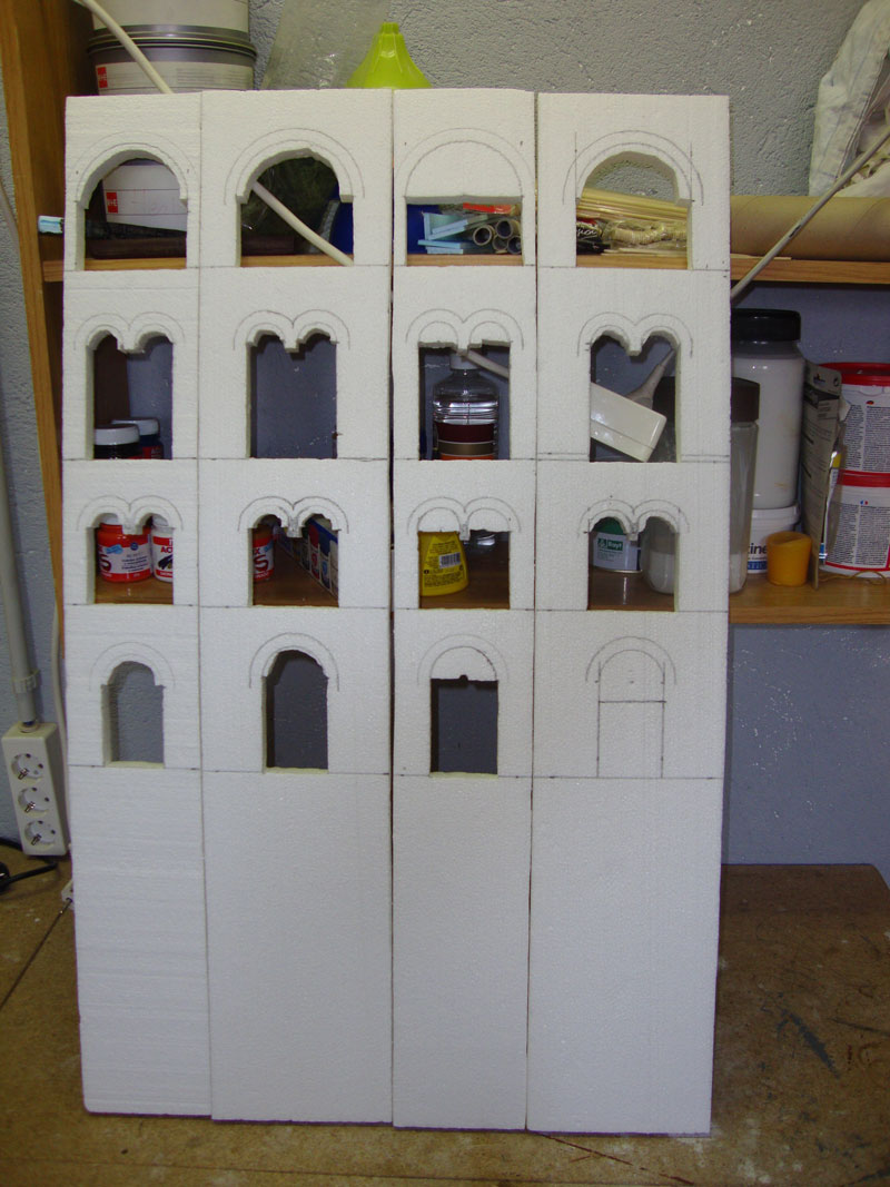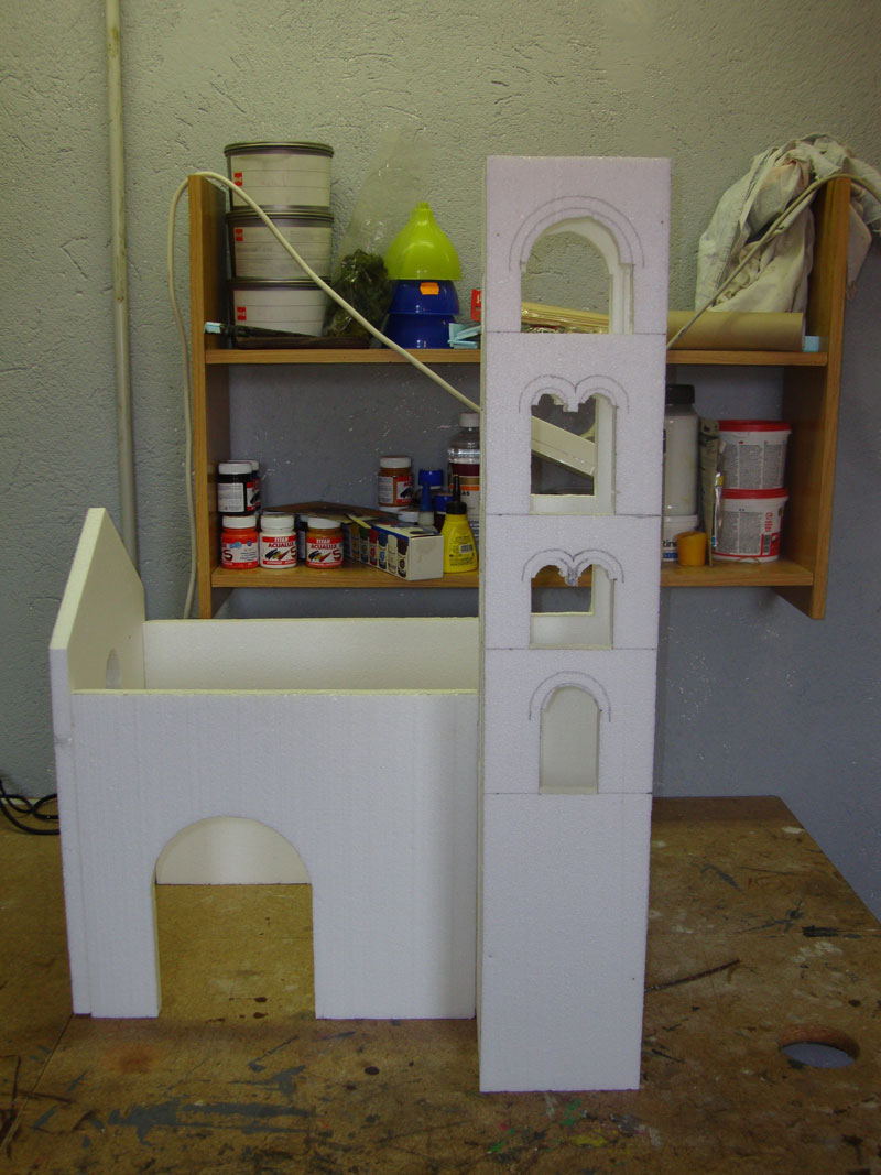 Yo sólo quería añadir que hay una forma de hacer las construcciones con porex blanco sin que se noten las bolitas: antes de grabar los ladrillos con cutter o soldador se lija con una lija relativamente suave hasta que desaparezca la textura típica de las bolitas. Luego se marcan las piedras y por último se recubre de escayola antes de pintar.