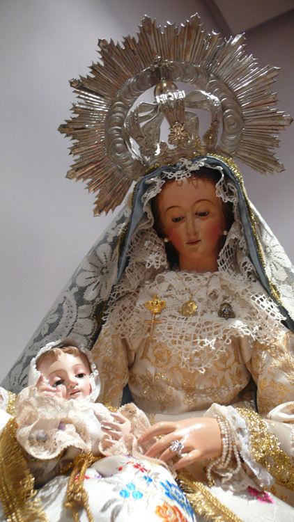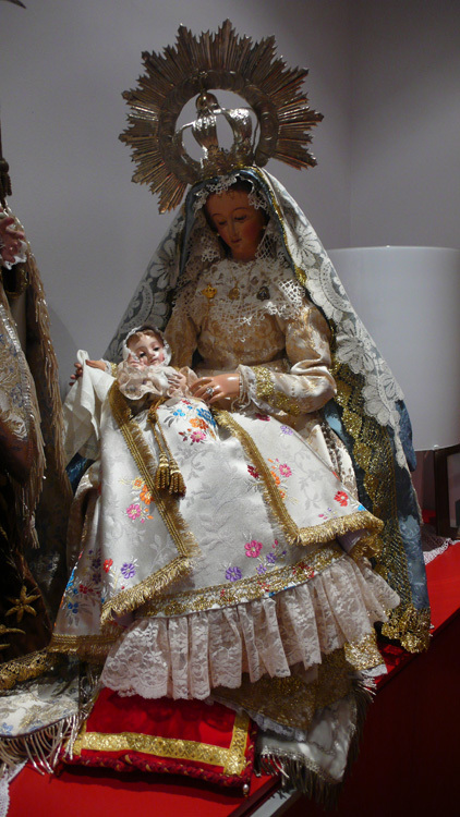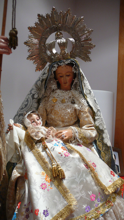 Hola a todos, quiero compartir con vosotros el belén de vestir que he puesto en mi casa este año, además del tradicional que pronto tambien pondré imágenes. Son dos figuras de 80cm de alto, San José lo he hecho yo con pasta de madera y la Virgen y el Niño son dos imágenes catalanas del siglo XIX en madera policromada, en realidad es una Virgen del Carmen que durante las navidades adapto para Virgen de Belén. La vestimenta mezcla ropas antiguas y nuevas, también confeccionadas por mí, mientras que las coronas son de plata, de principios de siglo, así como la vara de San José. Espero que os guste.