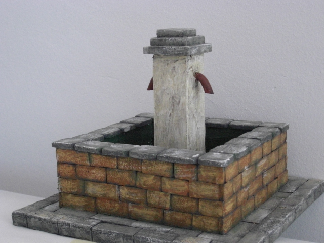 Hola Iscoco. La fuente echa agua y tiene unas dimensiones de 20cm.x20cm. El prisma que se ve en el centro lo corte en dos partes iguales y le hice a cada una de ellas una especie de regola para incrustar un tubito, como los que se usan para el riego por goteo. Al extremo del tubo le conecte una pieza en forma de T , a cada una de las dos partes de esta T le conecte dos pequeños tubos un poco curvados, que es por donde sale el agua. Cuando está toda la instalación terminada pego las dos partes de este prisma. Sobre el motor te puedo decir que es el potencia intermedia. En las tiendas de belenes me dijeron que solo tenían de tres niveles y con el mediano era suficiente.