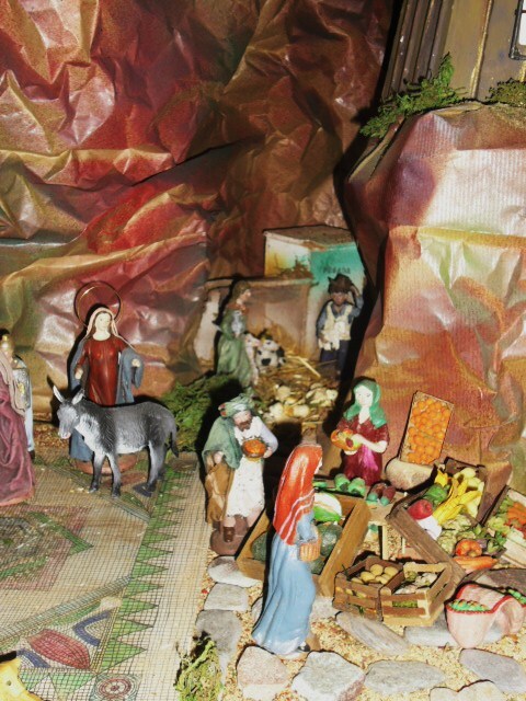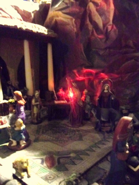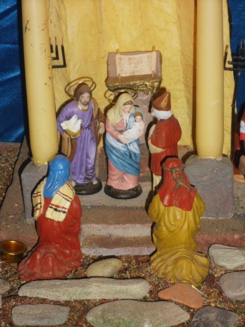 el belén tiene muchos elementos simbólicos, como el hecho que en casi todas las escenas donde aparece o la virgen maria o san josé hay una macetita de flores como ofrenda. en la anunciación de maría hay una maceta de calas blancas que simbolizan la pureza de maría y en el portal, en una esquina de la cueva, una mata de azucenas blancas, que simbolizan la virginidad de maría. las ofrendas que hay a los pies de maría y del niño en el portal, muchas son compradas y carecen de interés, pero hay otras que están ahi por motivos sentimentales. hay una cajita roja con una cinta azul, que es la de mi la medalla de la comunión. la puse de pequeño... y desde entonces, aunque descontextualice, me da gustico verla todos los años y ya hace 13 años. tambien hay un pin con forma de cabeza de cabra, bañado en plata, que pertenecia a mi abuelo, y lo pongo en homenaje a él. hay tambien un corazoncito dorado y de cristal rojo, que era una medallita rota de una tia abuela mia que vivió con nosotros en casa hasta que murió, y es una forma de tenerla tambien presente, y de ofrecerle al niño el corazón de la humanidad. y una piña, que cojí el mismo dia 3 de diciembre en el campo con mi pareja. la vimos chiquitina y tan perfecta que la puse ahi, y con el paso de los años recordaré ese bonito dia.