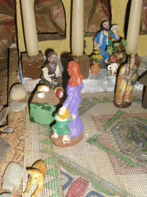 este año, aunque ya tenía las figuras, he querido mostrar junto al templo de la presentación, un pobre pidiendo y una madre dandole limosna, en sombolo de la caridad que tanta falta esta haciendo en este pais, y en fechas como estas, tantisima pena me da de ver como un pais que hemos prestado ayuda a otros paises no solo ya no podamos prestarsela, si no que ya la necesitamos nosotros mismos. asi, le rindo mi pequeño homenaje a todo aquel que lo esté pasando mal.