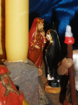 el belén tiene muchos elementos simbólicos, como el hecho que en casi todas las escenas donde aparece o la virgen maria o san josé hay una macetita de flores como ofrenda. en la anunciación de maría hay una maceta de calas blancas que simbolizan la pureza de maría y en el portal, en una esquina de la cueva, una mata de azucenas blancas, que simbolizan la virginidad de maría. las ofrendas que hay a los pies de maría y del niño en el portal, muchas son compradas y carecen de interés, pero hay otras que están ahi por motivos sentimentales. hay una cajita roja con una cinta azul, que es la de mi la medalla de la comunión. la puse de pequeño... y desde entonces, aunque descontextualice, me da gustico verla todos los años y ya hace 13 años. tambien hay un pin con forma de cabeza de cabra, bañado en plata, que pertenecia a mi abuelo, y lo pongo en homenaje a él. hay tambien un corazoncito dorado y de cristal rojo, que era una medallita rota de una tia abuela mia que vivió con nosotros en casa hasta que murió, y es una forma de tenerla tambien presente, y de ofrecerle al niño el corazón de la humanidad. y una piña, que cojí el mismo dia 3 de diciembre en el campo con mi pareja. la vimos chiquitina y tan perfecta que la puse ahi, y con el paso de los años recordaré ese bonito dia.
