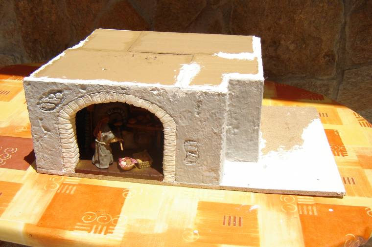 Retomamos el hilo con la siguiente construcción para el Belén. Se trata de la PANADERÍA. El material base empleado es poliuretano (corcho). He cogido un tablero aglomerado para hacer la base de la casa.